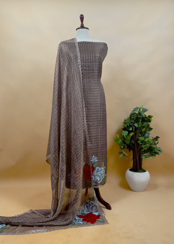 Luxe Walnut Brown Handloom Self Woven Tissue Silk Suit Fabric With Pitta Work And Bharwa Embroidery