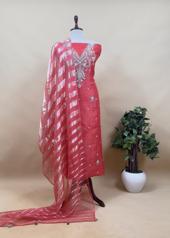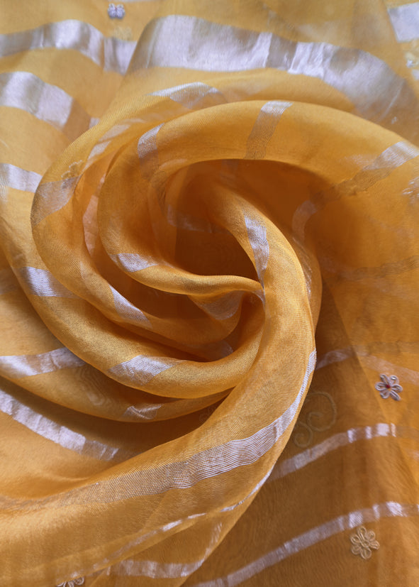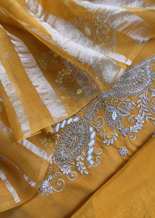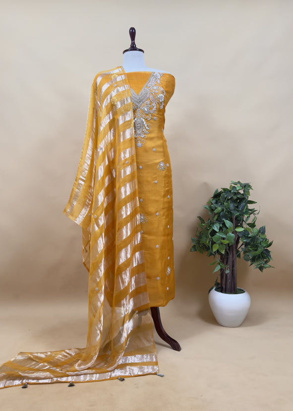 Luxe Yellow Silk Suit Fabric And Organza Panel Dupatta With Dabka, Dori And Zardosi Handwork