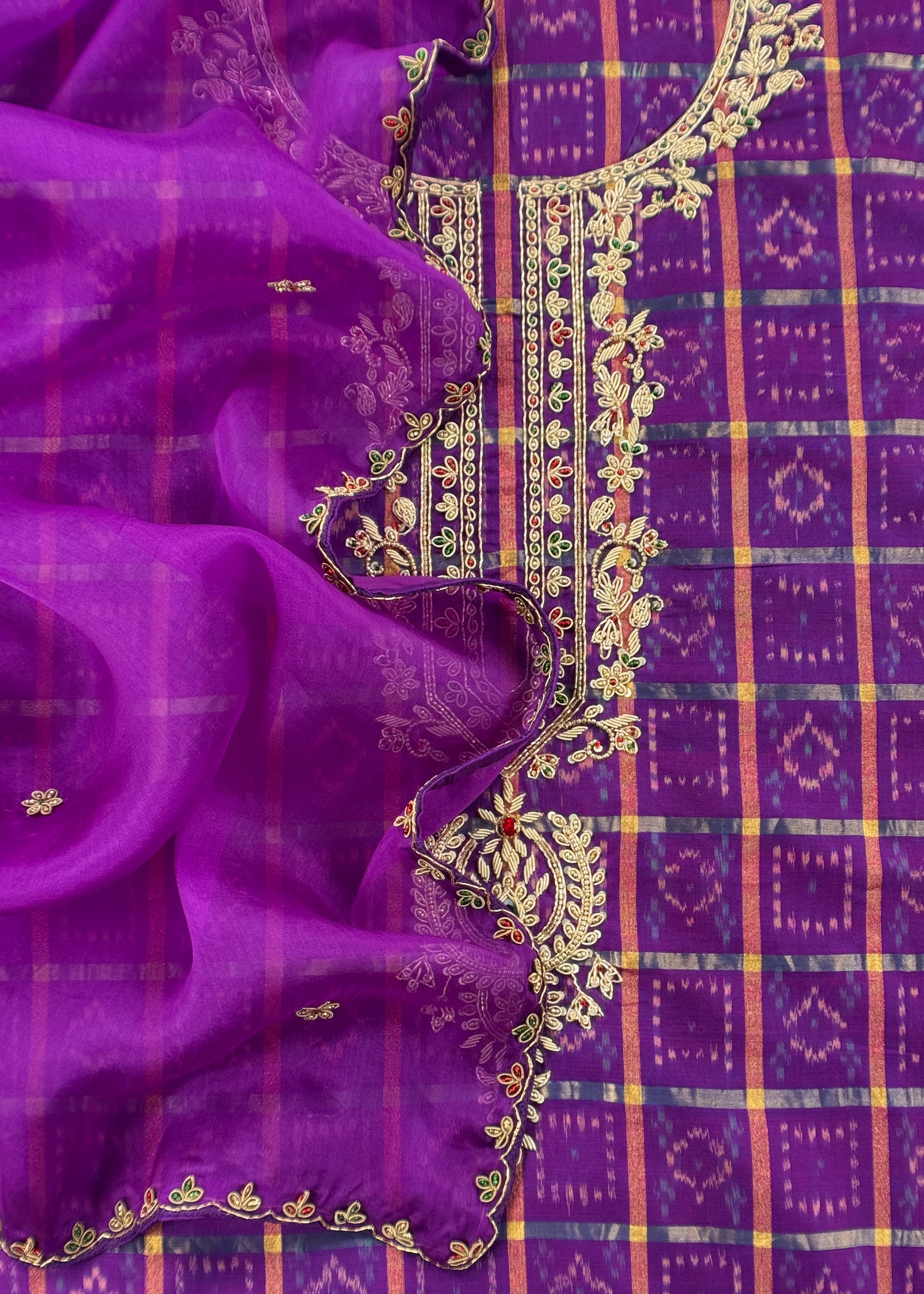 Mahalakshmi Violet Handloom Ikkat gold checks kurta and Organza dupatta with Jadau zardosi zari Handwork