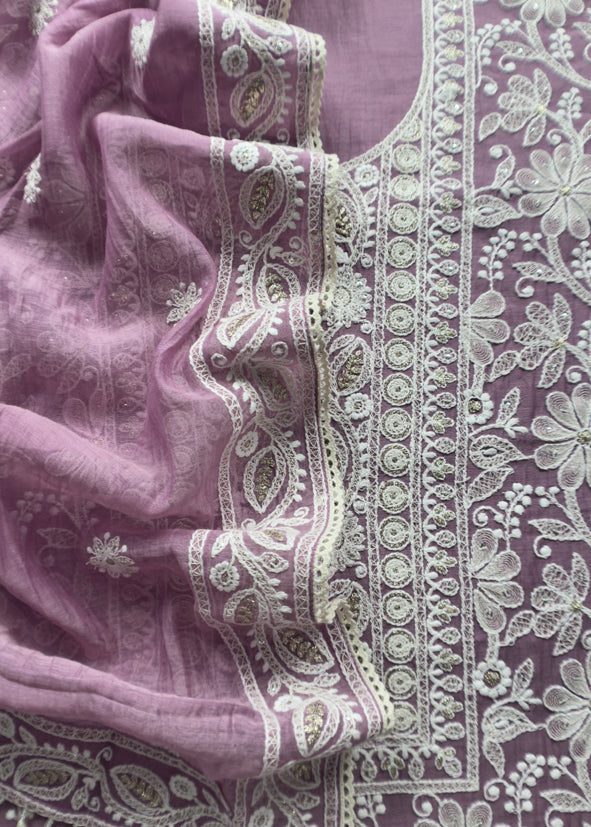 Shop lakhnavi-style beautiful pure mulmul kurta and dupatta adorned with beautifully embroidered all over the kurta pearl buttons, zari detailings, all over bootis, and four side dupatta borders with crochet lace endings. The suit comes with plain matching cotton silk lowers.