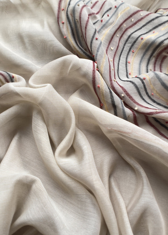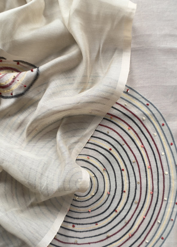 This Jamdani suit in viscose muslin features Kantha hand embroidery on the kurta and dupatta. The three-piece ensemble includes a plain cotton satin bottom.