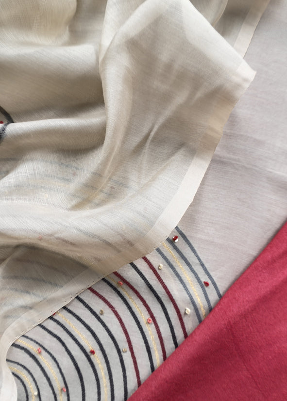 Maroon Jamdani Weaved Muslin Suit With Kantha Embroidery