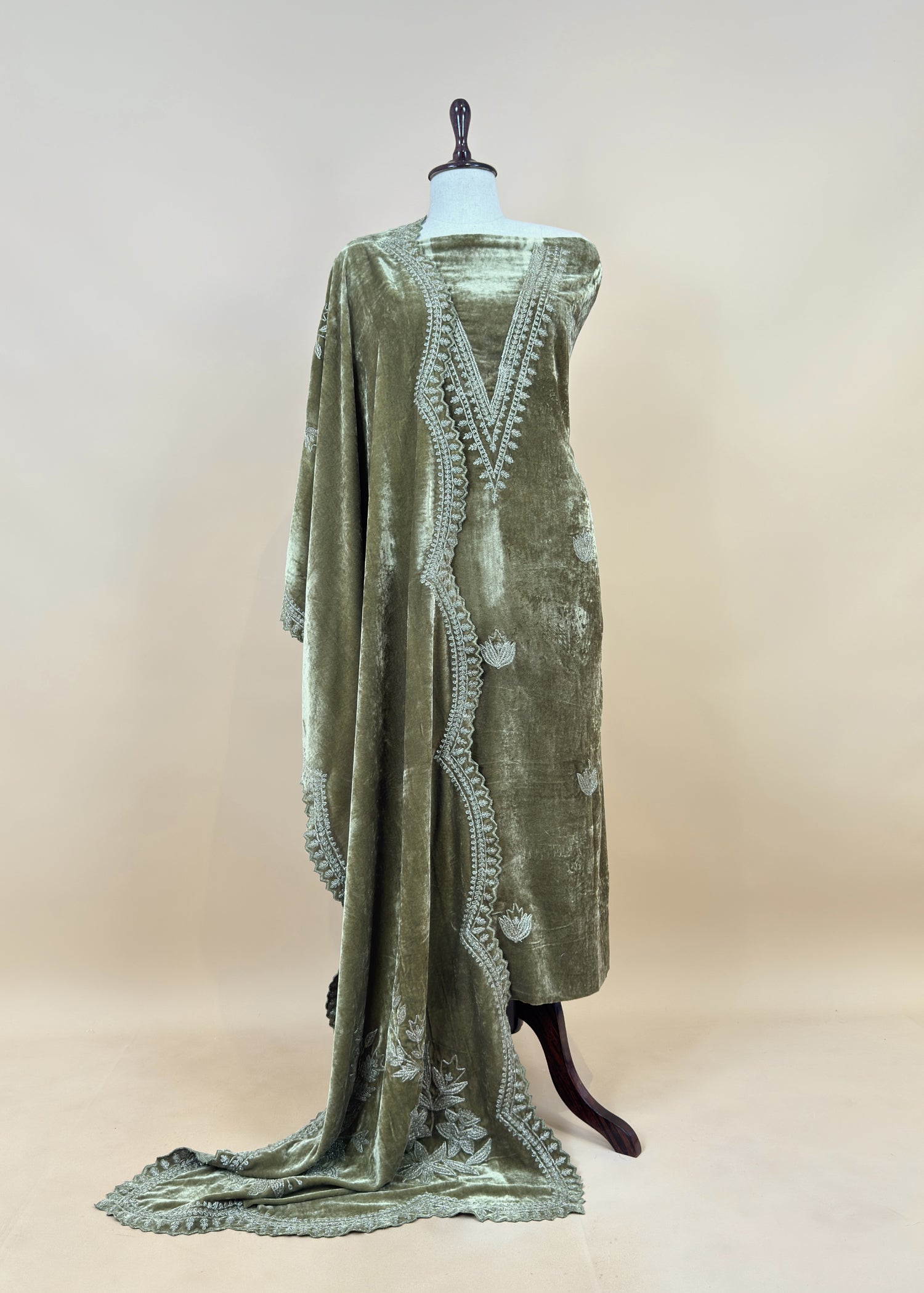 Three-piece unstitched suit set crafted with pure velvet fabric, comprising kurta with embellished v neckline, all over bootis with Dori hand embroidery, velvet dupatta with four side detailed scalloped borders with elaborate corners and a matching pure velvet bottom.