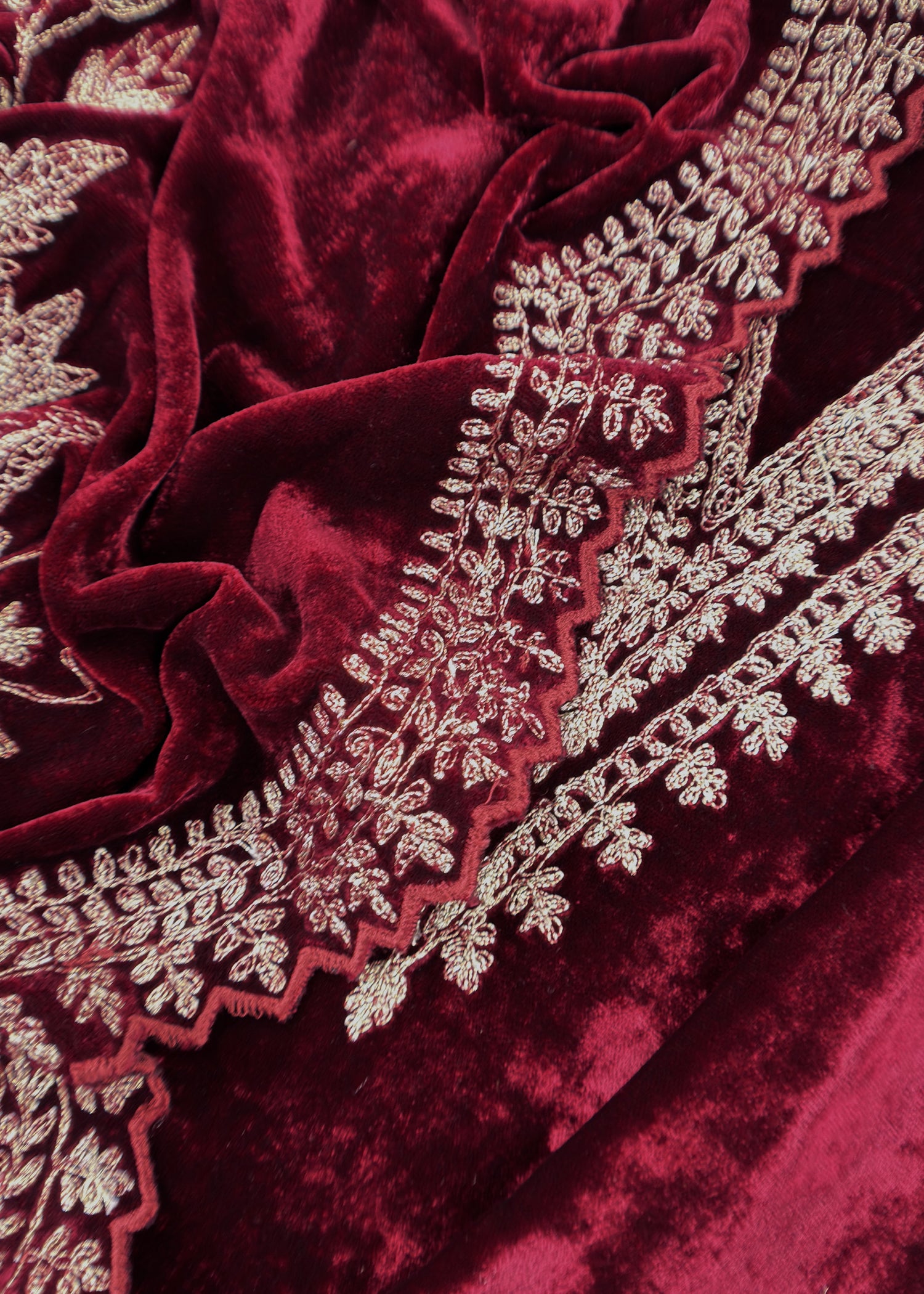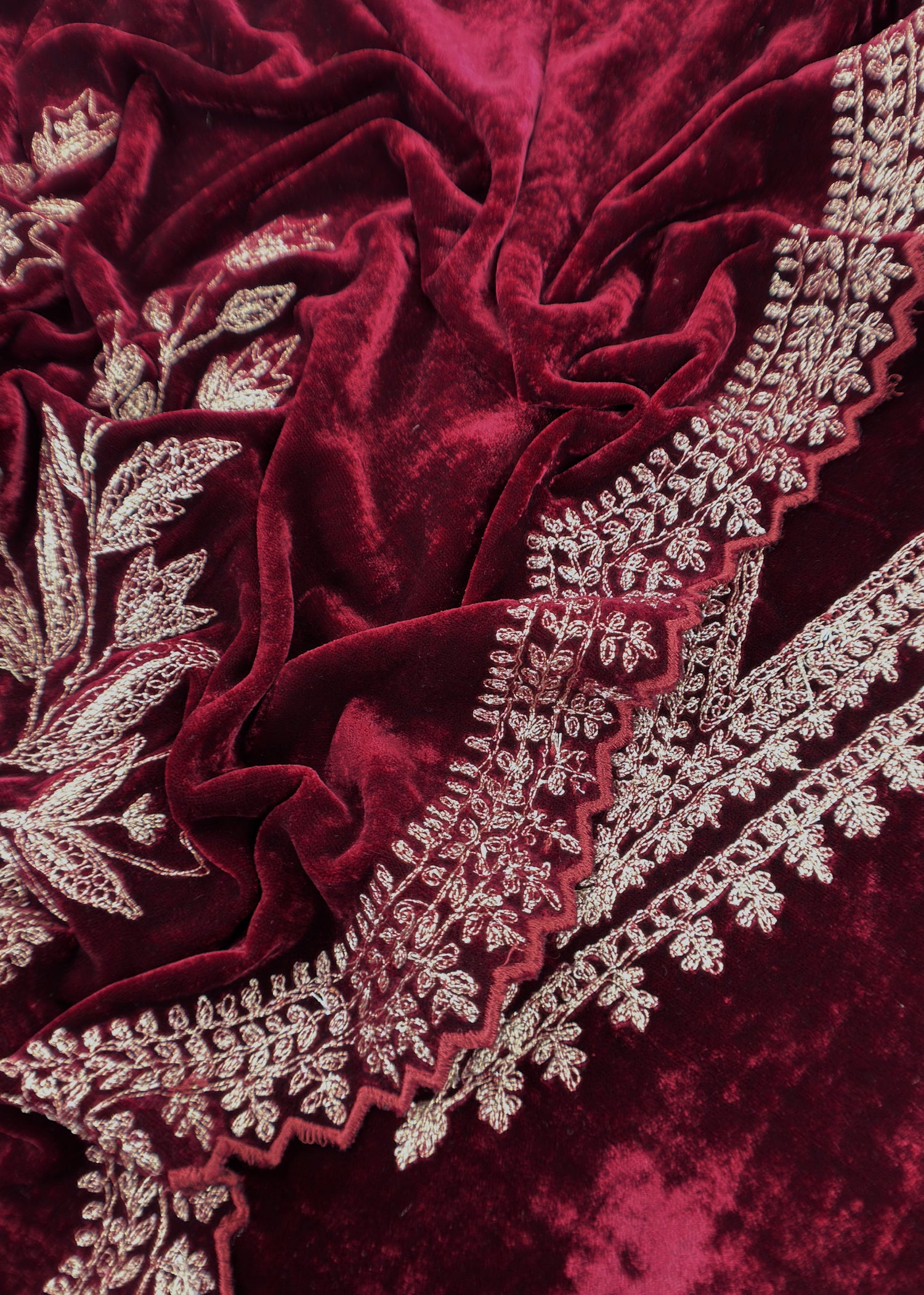 Maroon Pure Velvet Unstitched Suit In Dori Embroidery