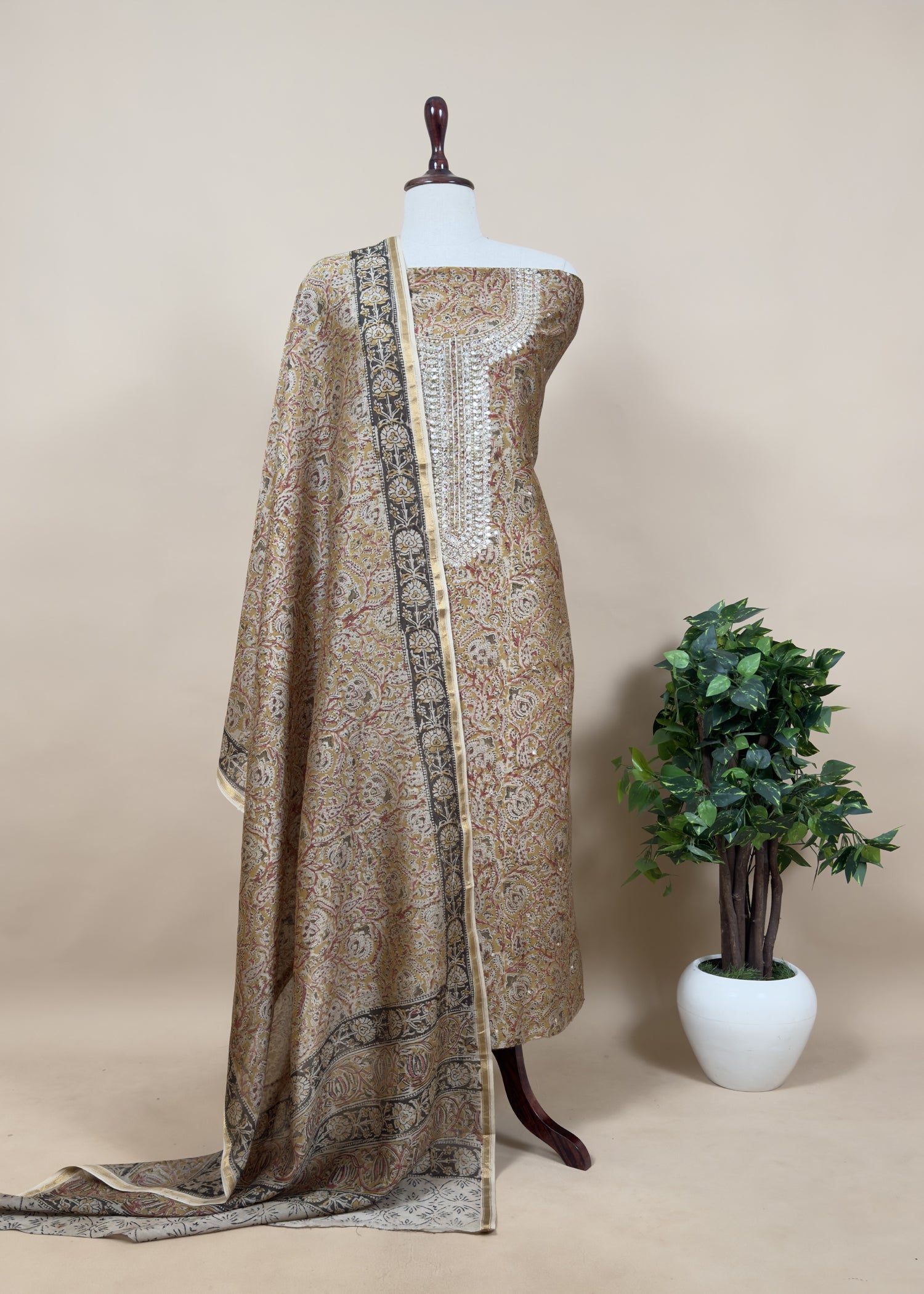 The Sanganeri hand-blocked Natural dyed suit fabric in pure Chanderi is embellished with elegant gota patti and mirror handwork along the neckline, with beautiful thread and mirror hand-embroidered motifs all over the kurta. This three-piece suit comes with a hand-blocked dupatta in pure Chanderi, complemented by plain cotton bottoms.