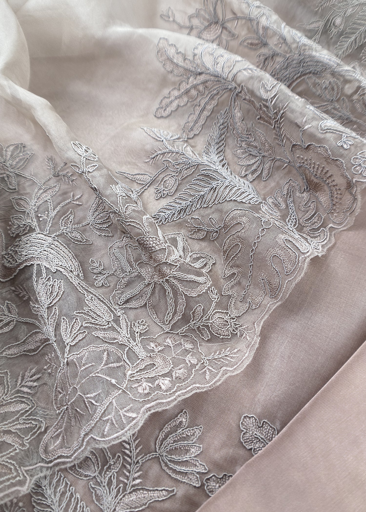 A beautifully crafted, pure handwoven organza three-piece suit with exquisite French thread embroidery. The dupatta features a stunning four-sided French thread embroidery border is paired with a fine crepe silk bottom, this ensemble exudes elegance and traditional charm. Perfect for any special occasion, it combines artistry with luxurious fabrics for a truly unique look.