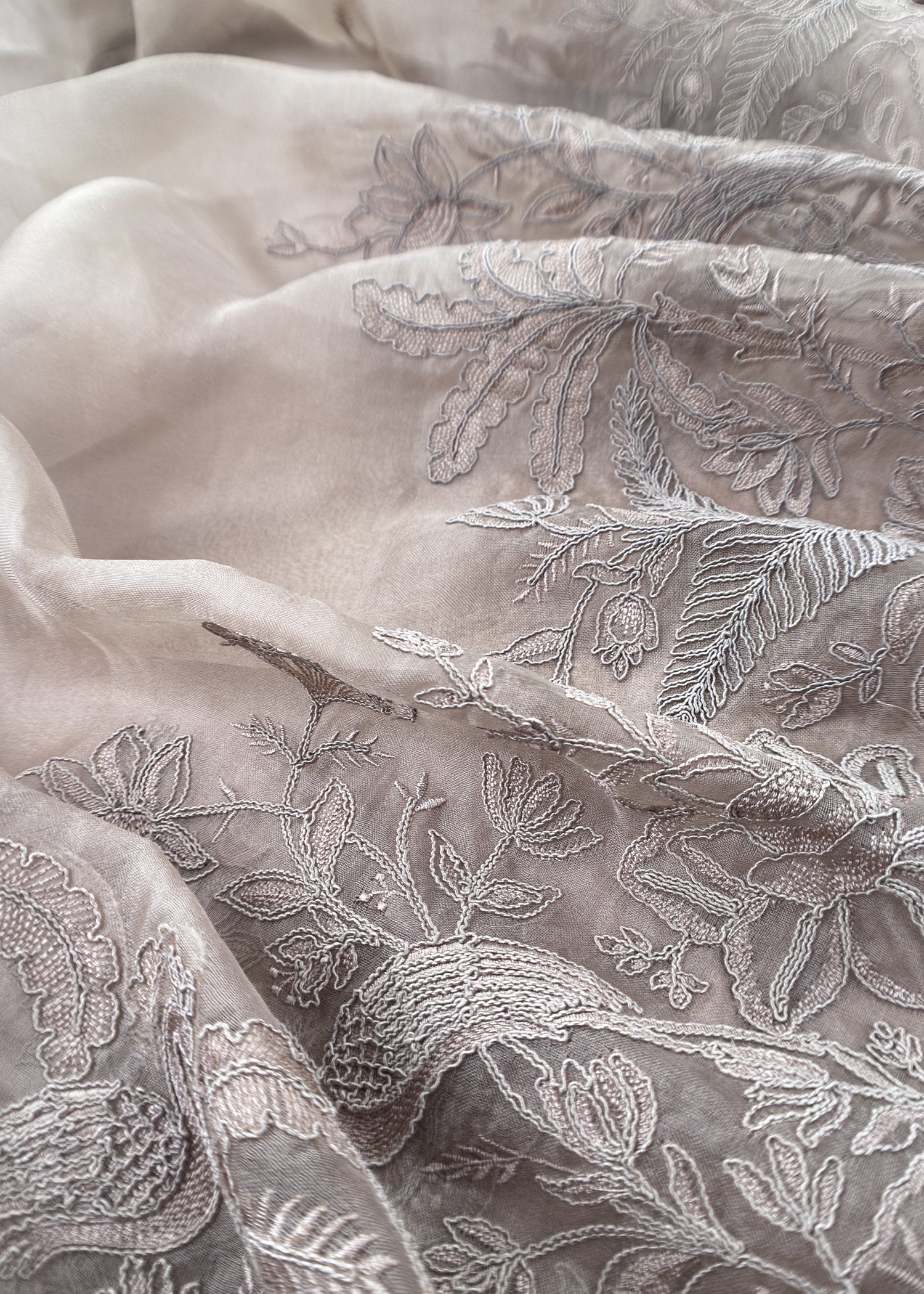Metallic Grey Kalasheel Luxe Handloom Organza Suit With Garden French Embroidery