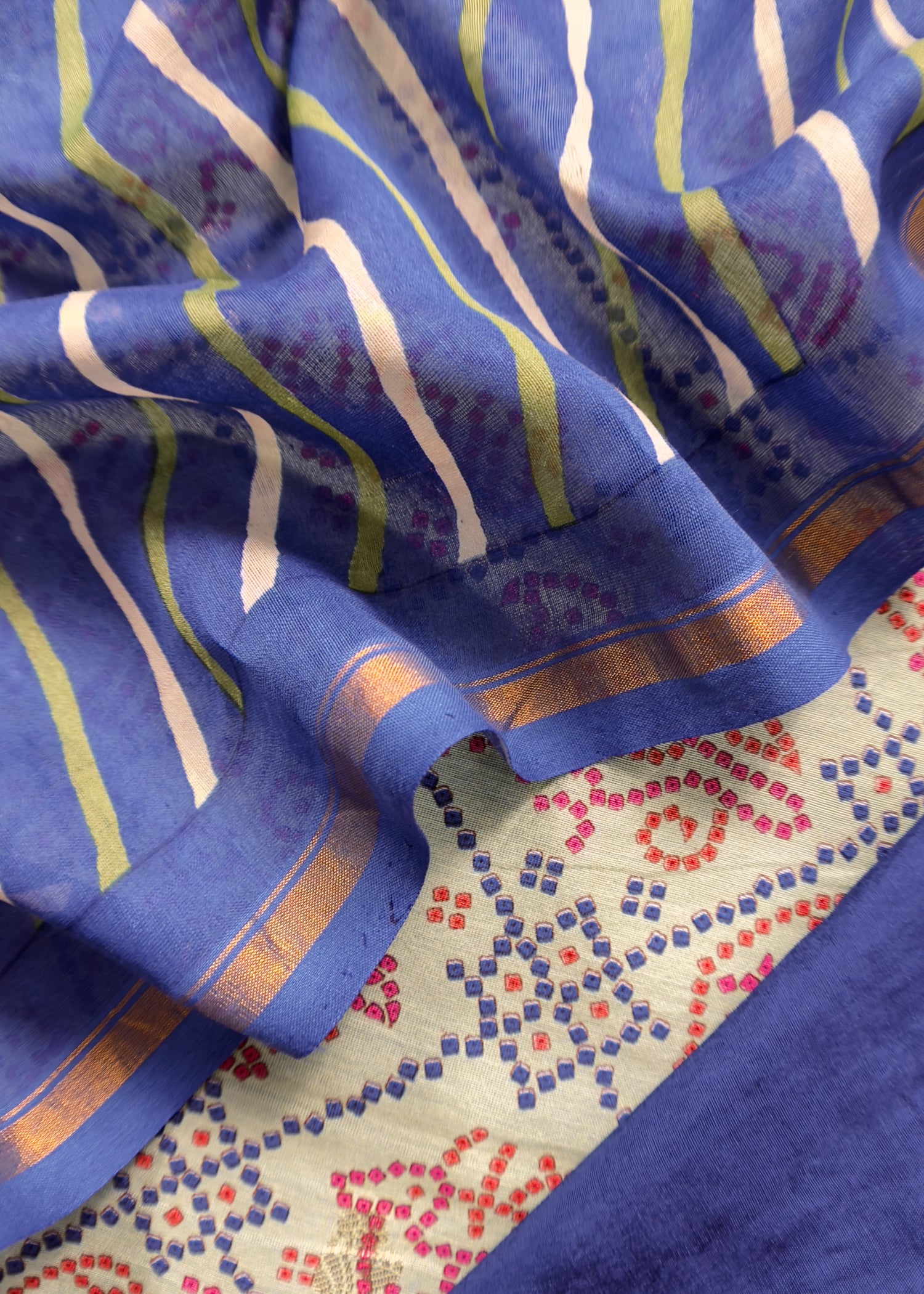 Three-piece unstitched suit fabric crafted in pure Maheshwari silk with beautiful Banarasi bootis Patola Kurta paired with Double Shade Leheriya Dupatta for your summer wardrobe. This timeless traditional suit comes with plain cotton satin lowers.