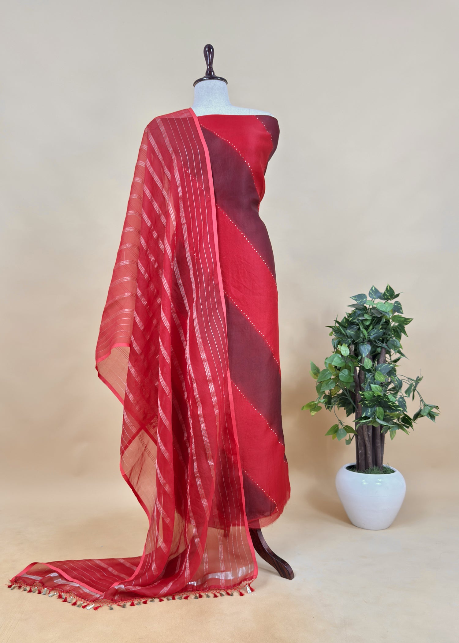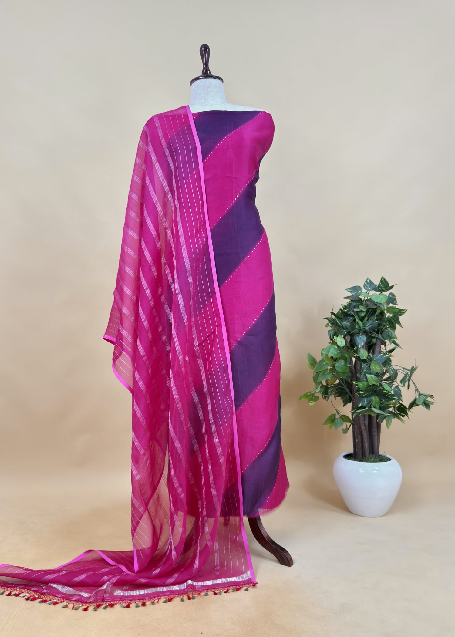 Shop color block pattern handloom kurta in Pure Organza Silk paired with gorgeous organza silk dupatta with all over gold zari woven panels and matching crepe silk lowers.