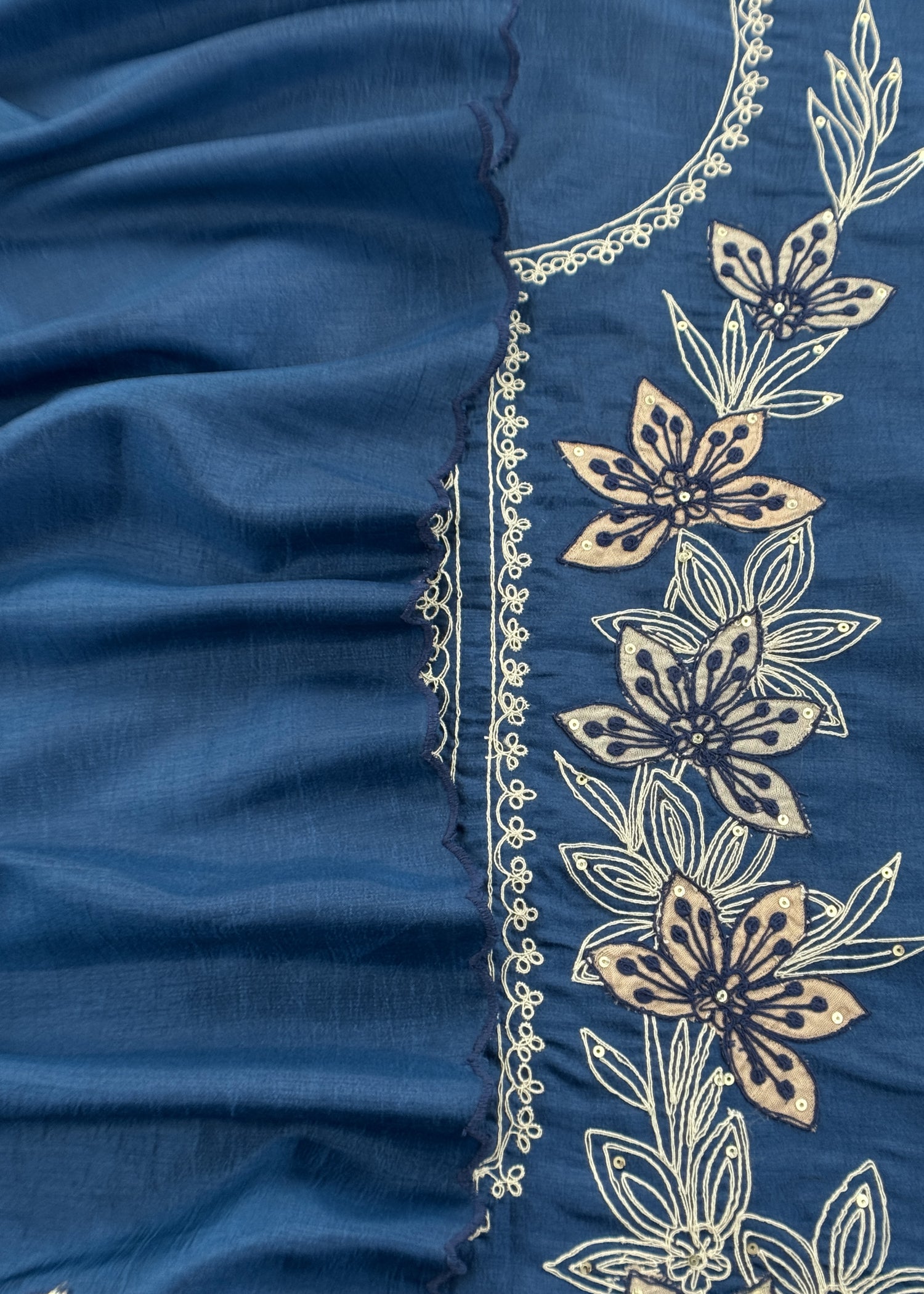 Royal Blue Satin Silk Suit Fabric With Dori And Zardosi Embroidery