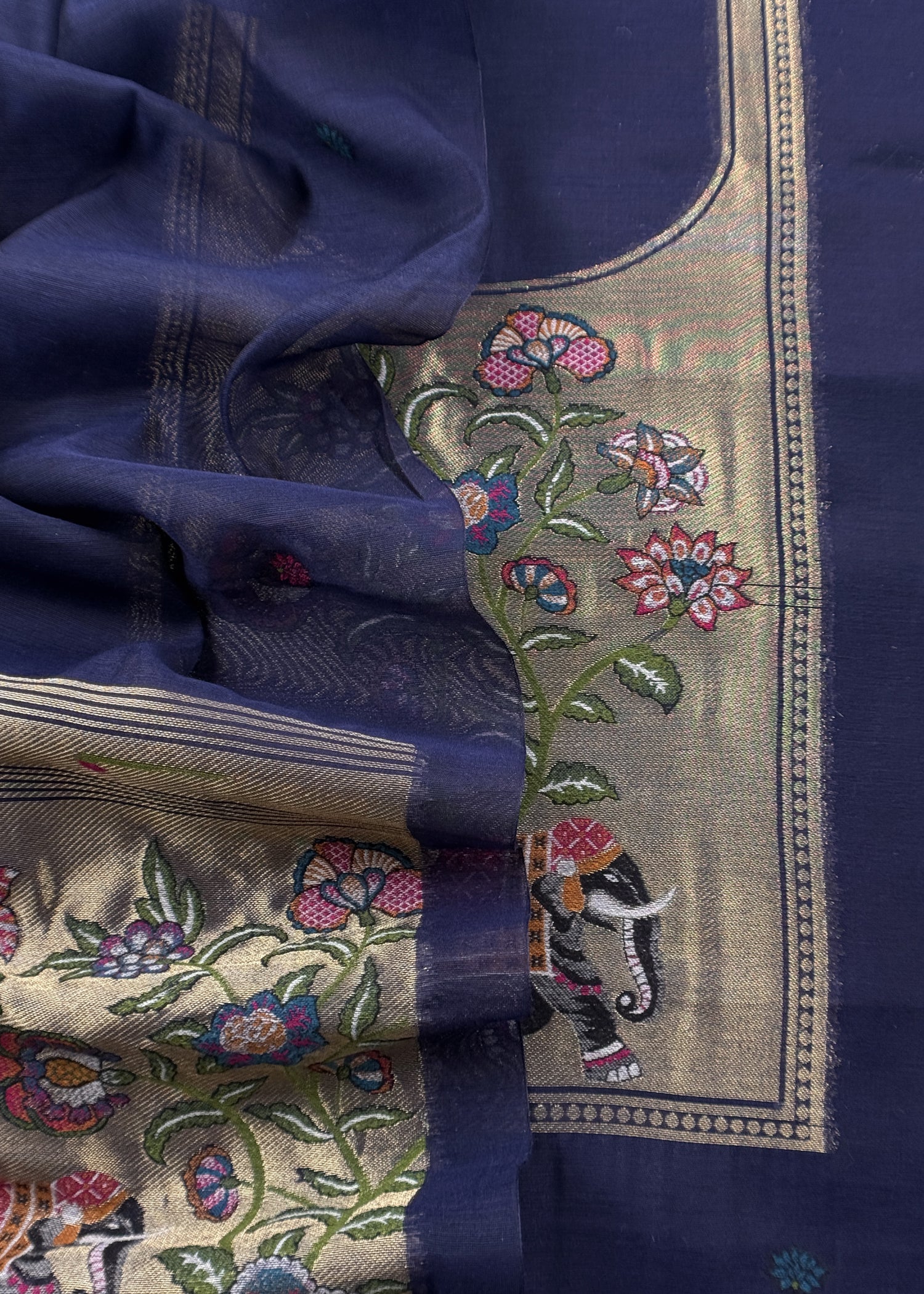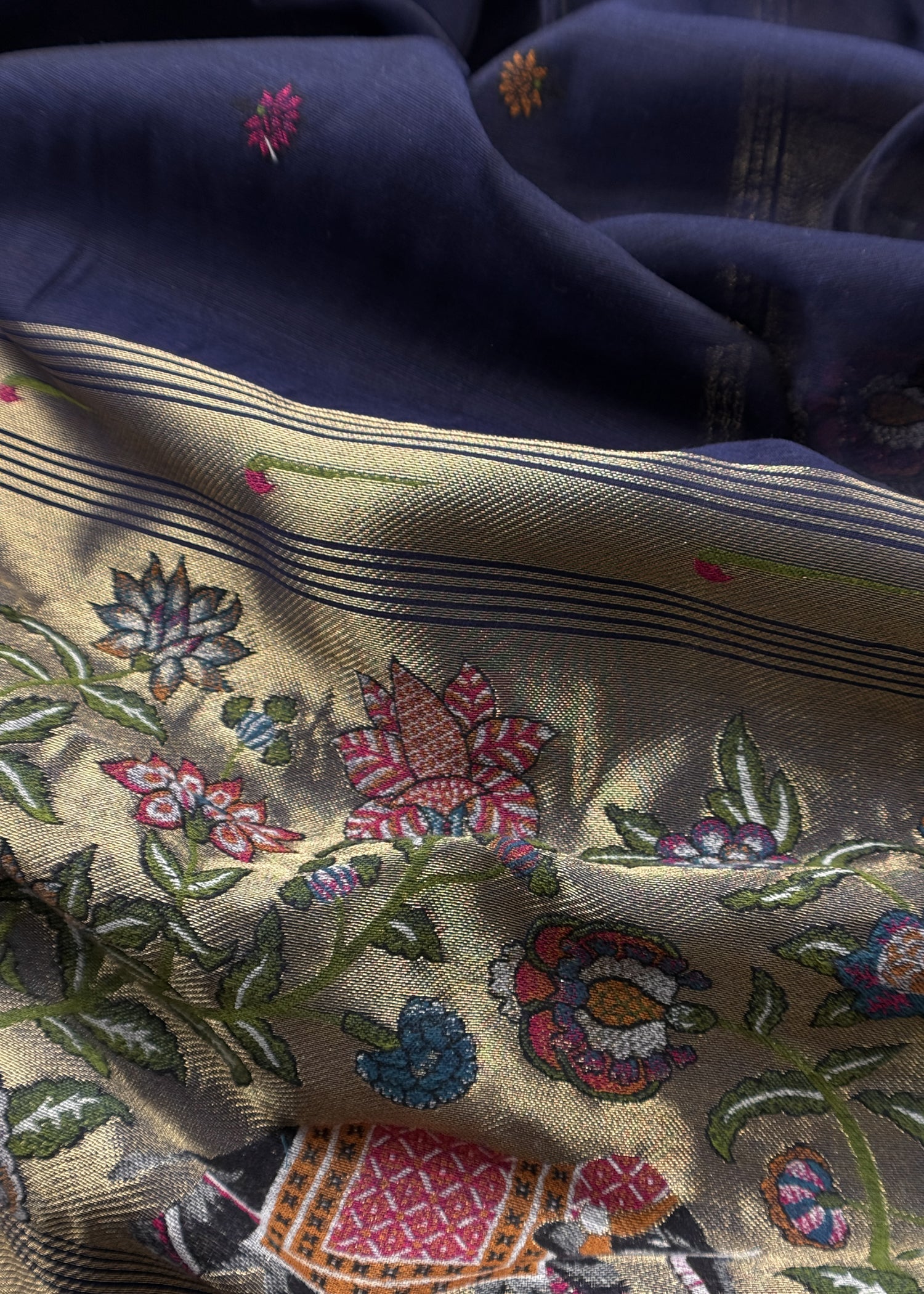 Navy Blue Jamdani Woven Unstitched Suit With Paithani Work