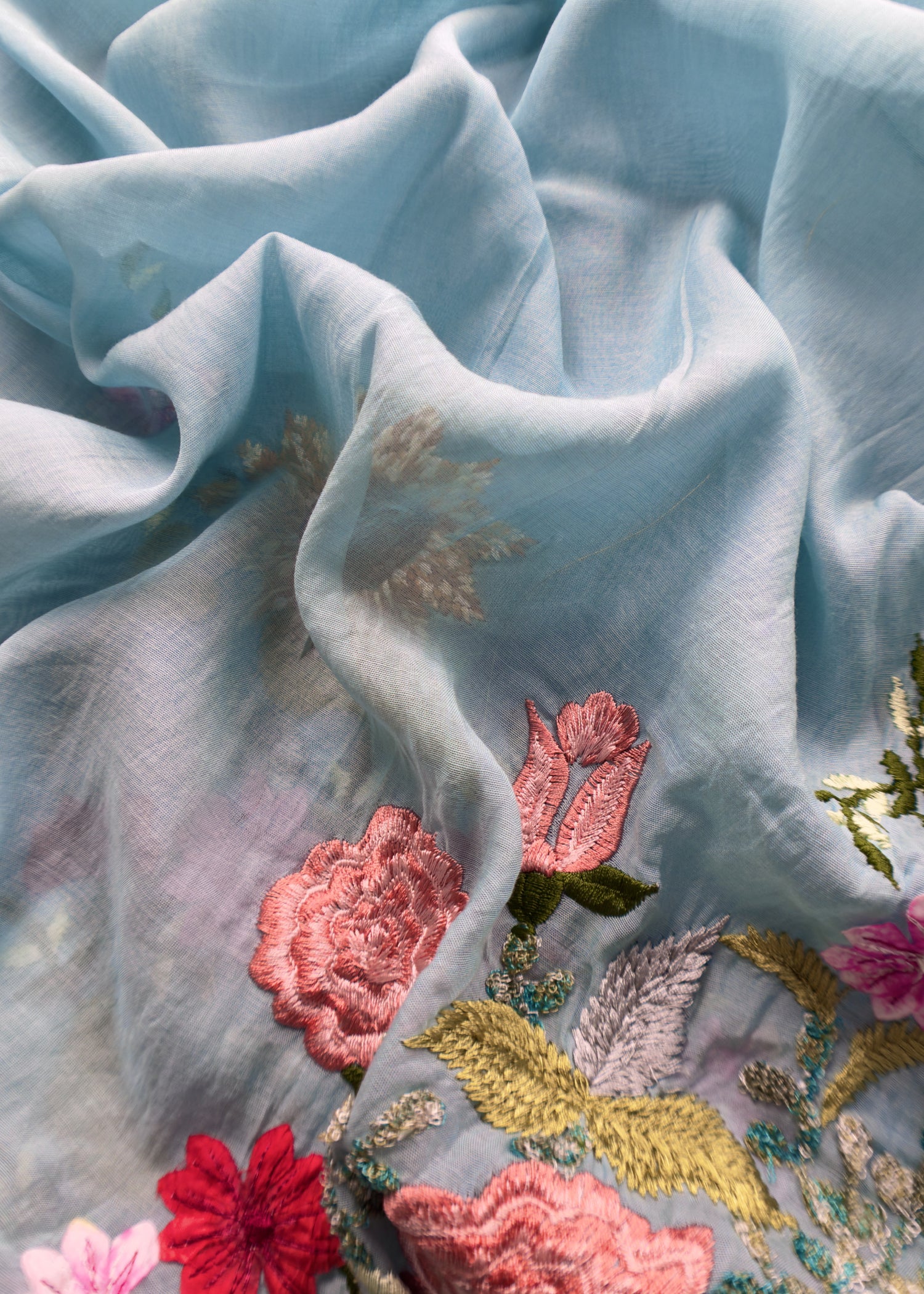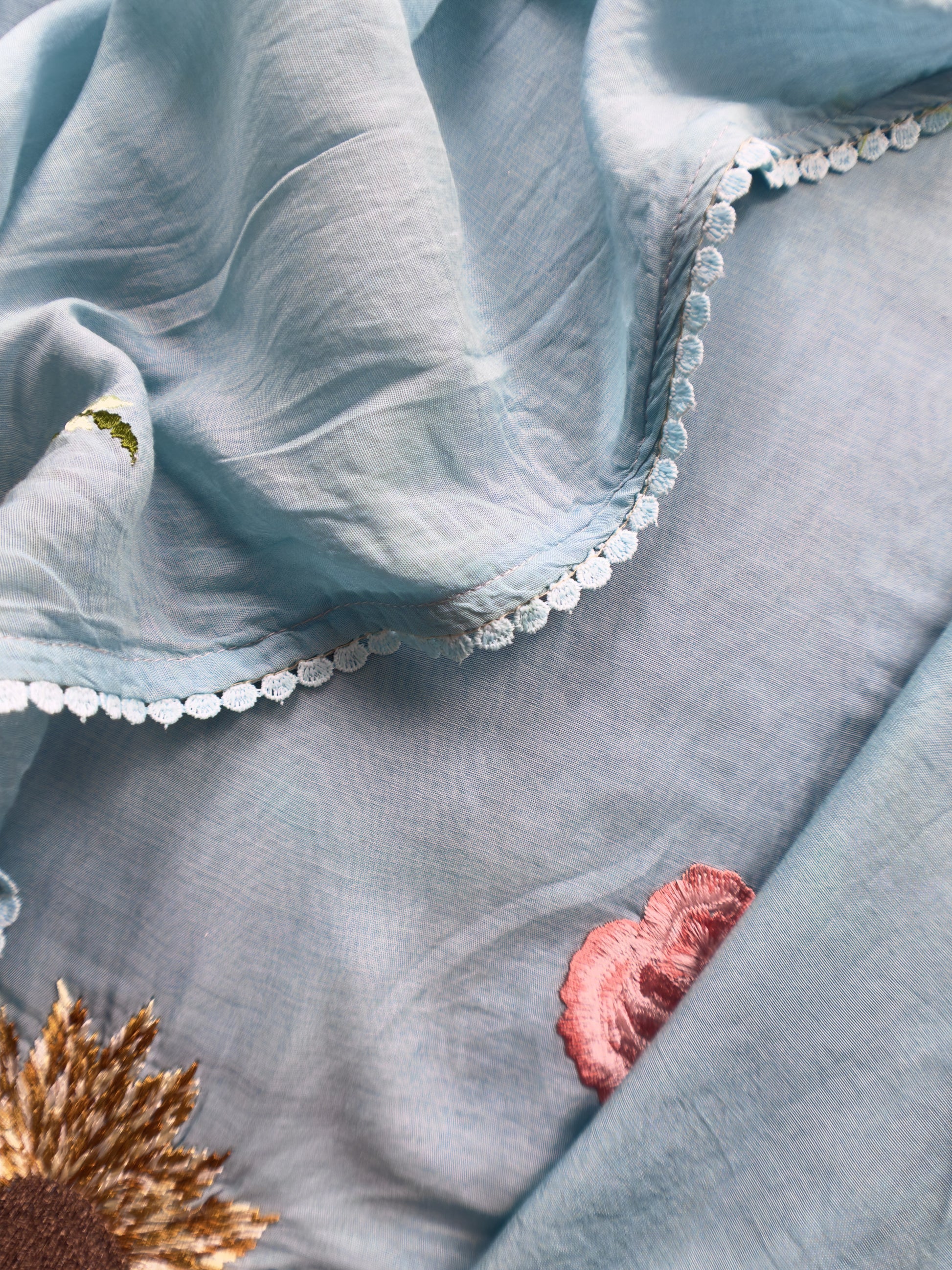 Ocean Blue Pure Mul Cotton Sunflower Suit With Resham Embroidery And Appliqué Work