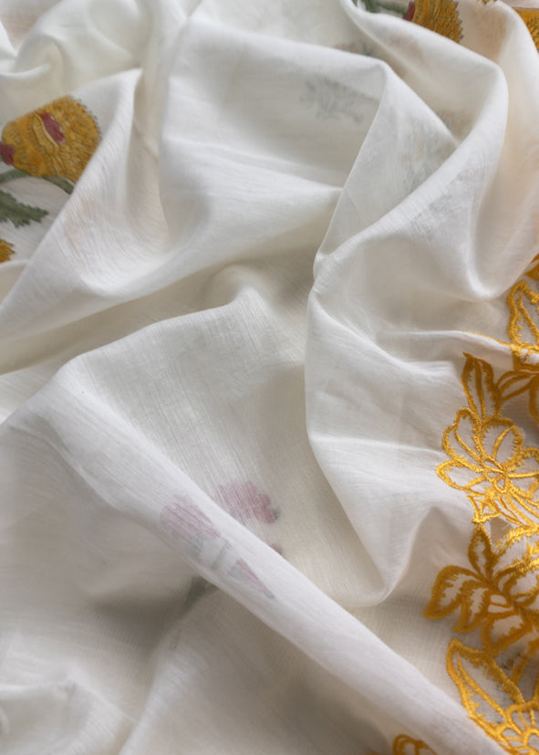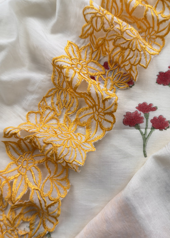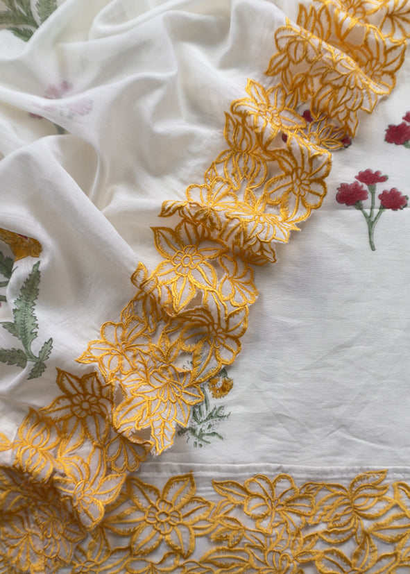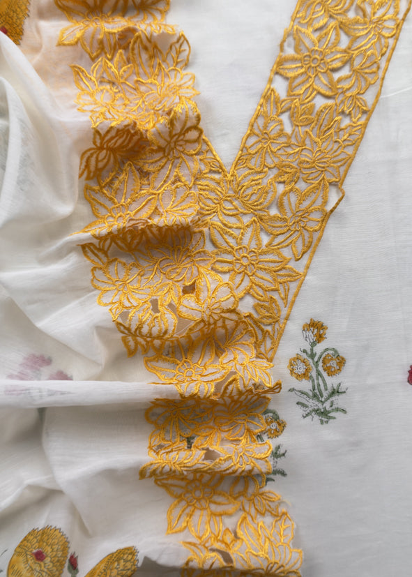 Off White And Mango Pure Mul Chanderi Block Print Suit With Laser Cut embroidery