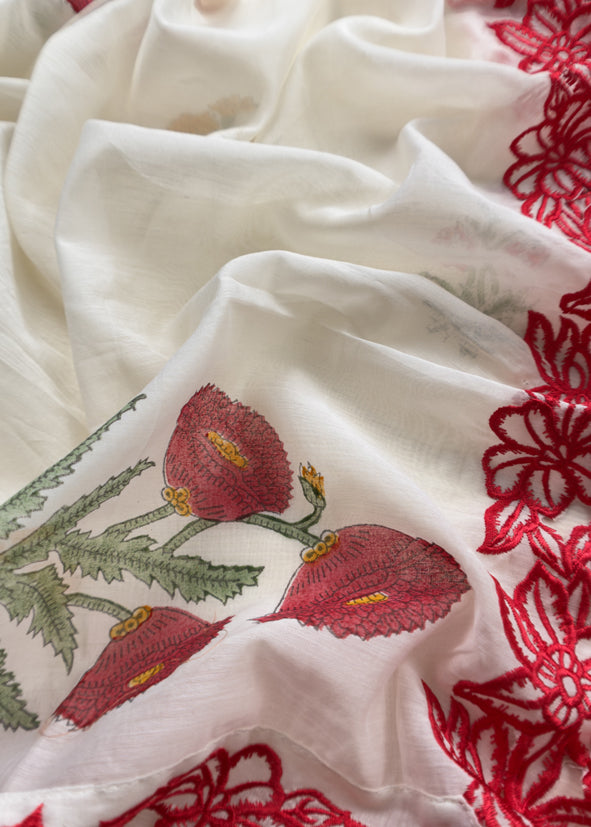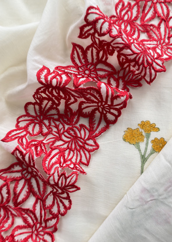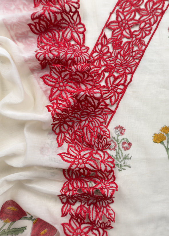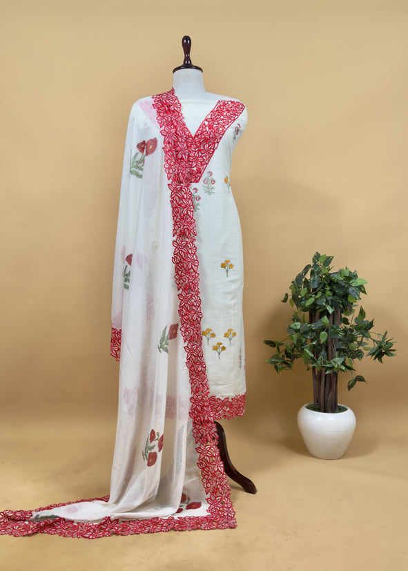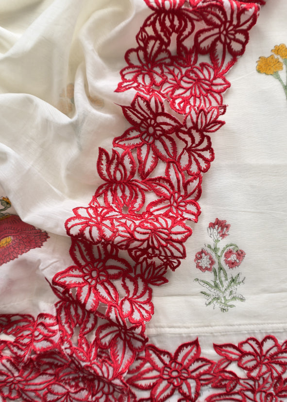 Off White And Red Pure Mul Chanderi Block Print Suit With Laser Cut embroidery