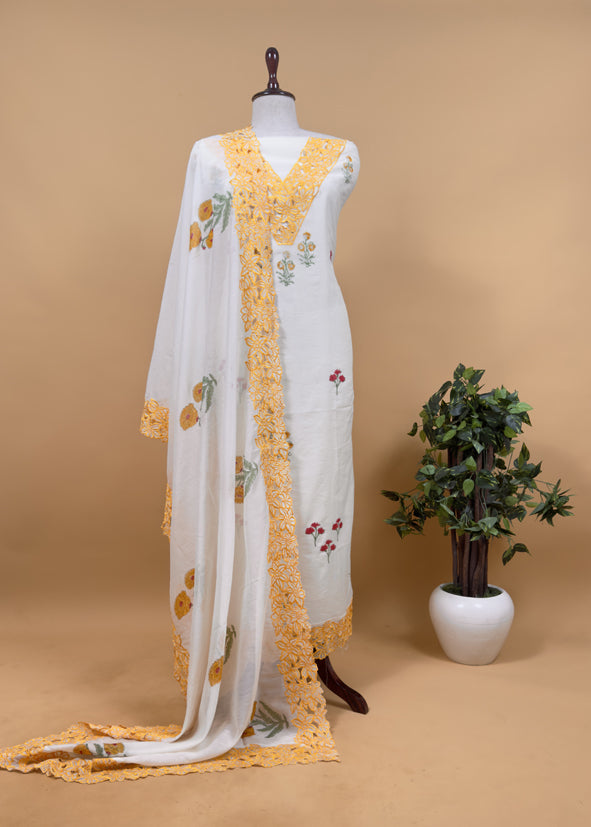 Shop this beautiful three-piece suit featuring a pure mul Chanderi hand-block print kurta and dupatta, enhanced with laser cut embroidery on the neckline, ghera, and all four sides of the dupatta. It comes with matching cotton satin lowers for a complete and comfortable outfit.