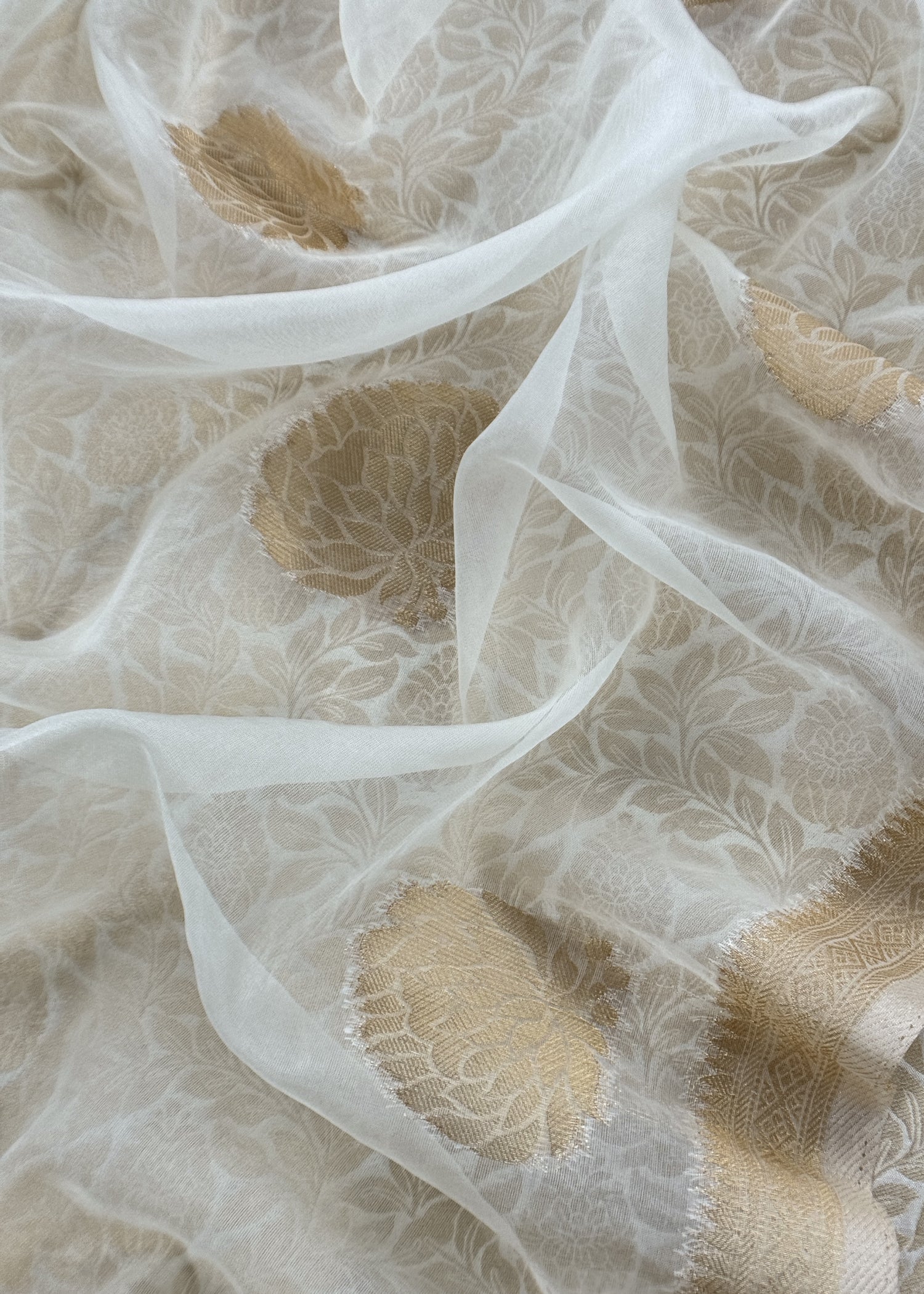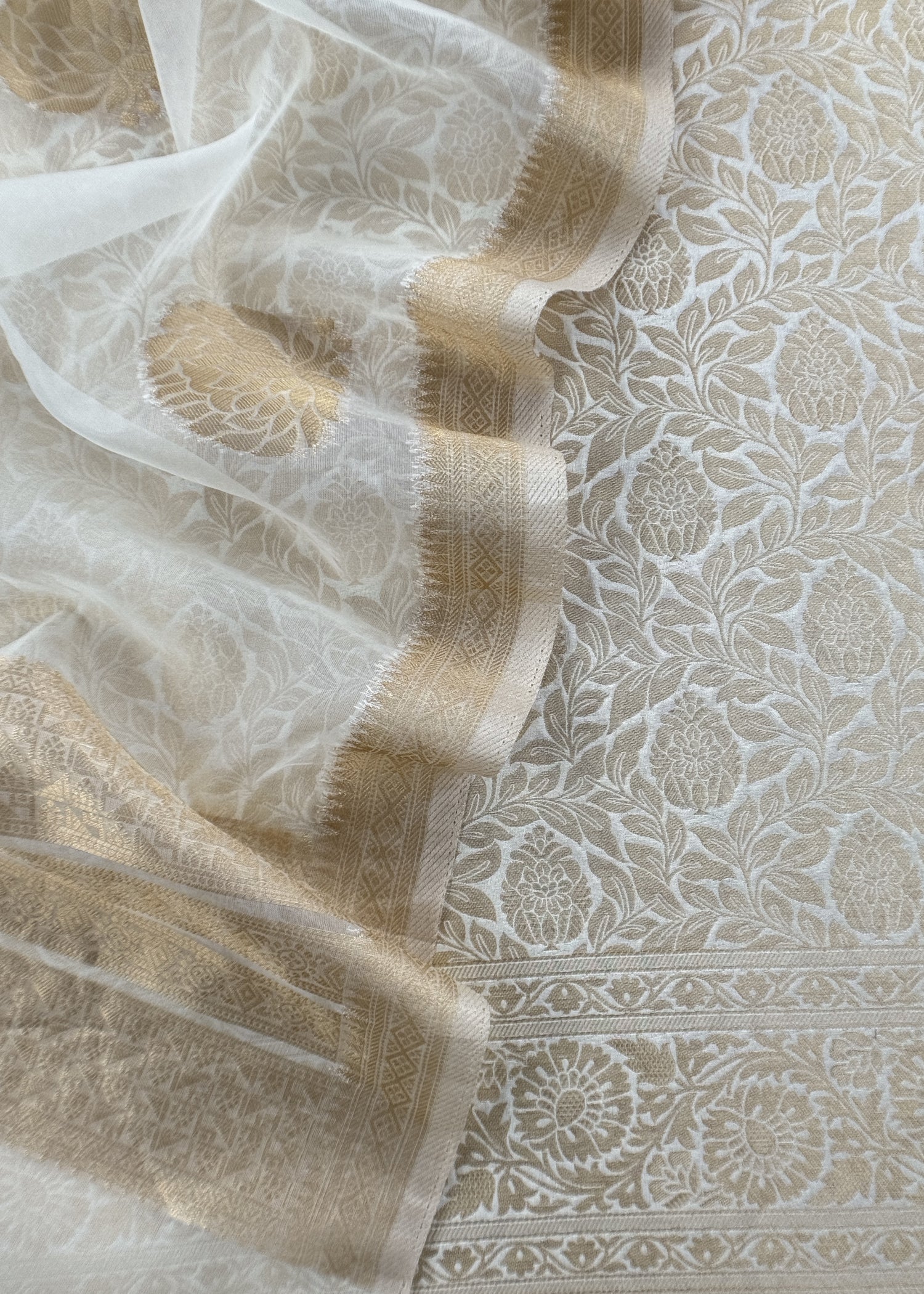 Off White Banarasi Silk Brocade Suit With Organza Dupatta