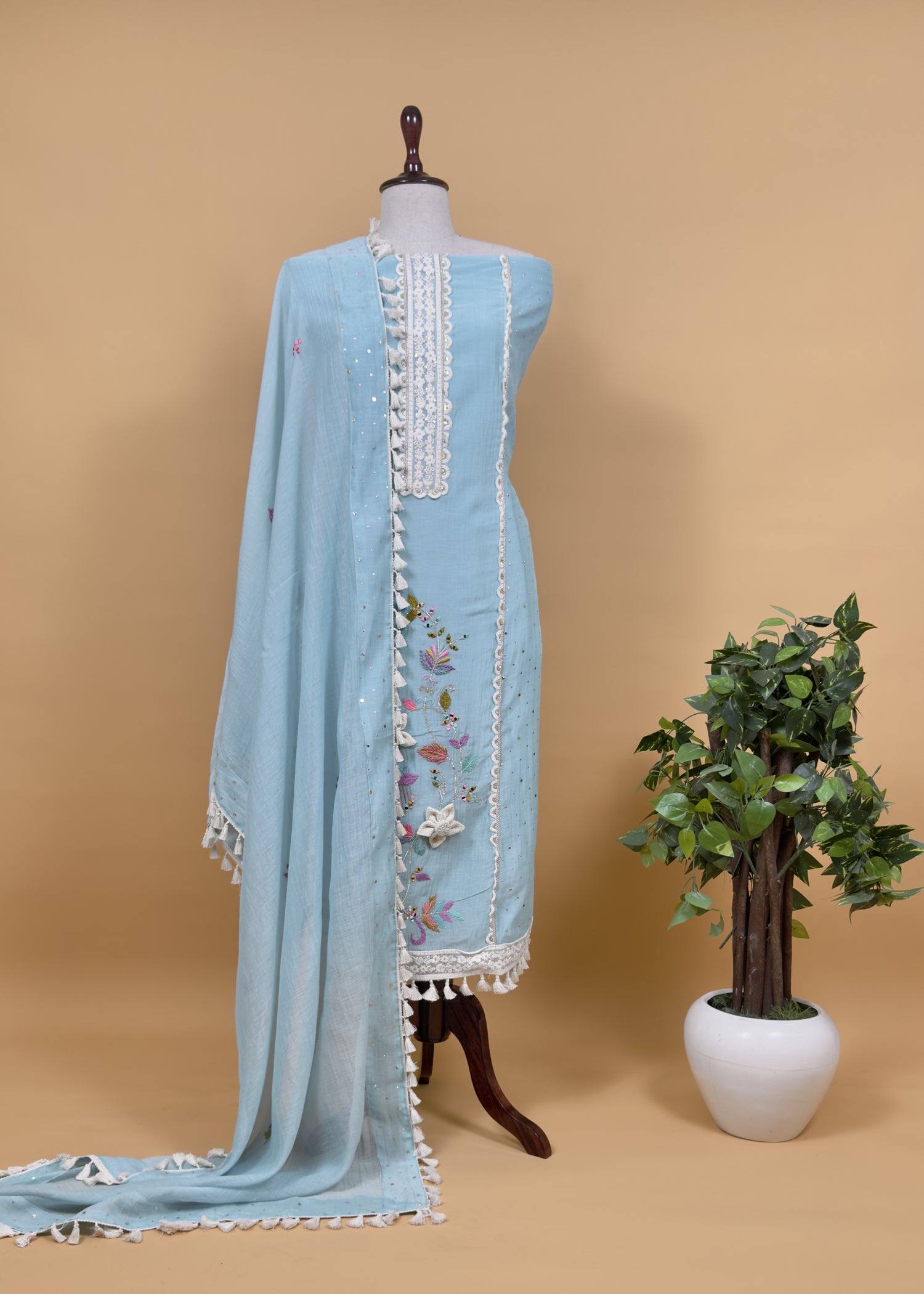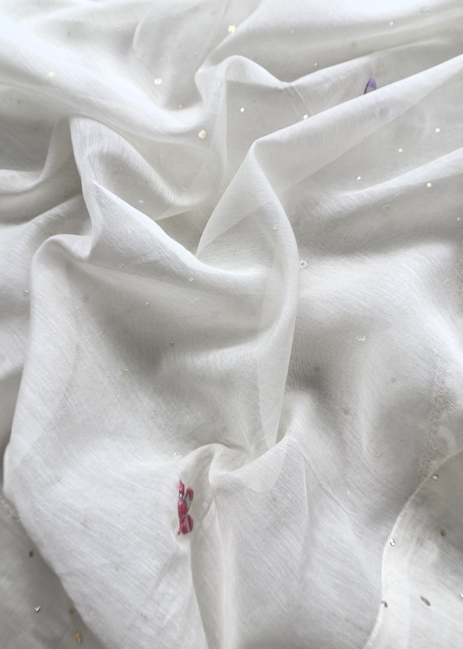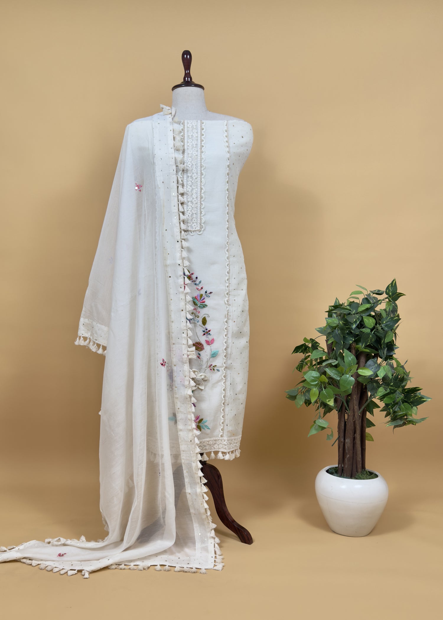 Off White Designer Summers Pure Mul Suit With Crochet, Mirrors, Pitta Work And Hand Embroidery