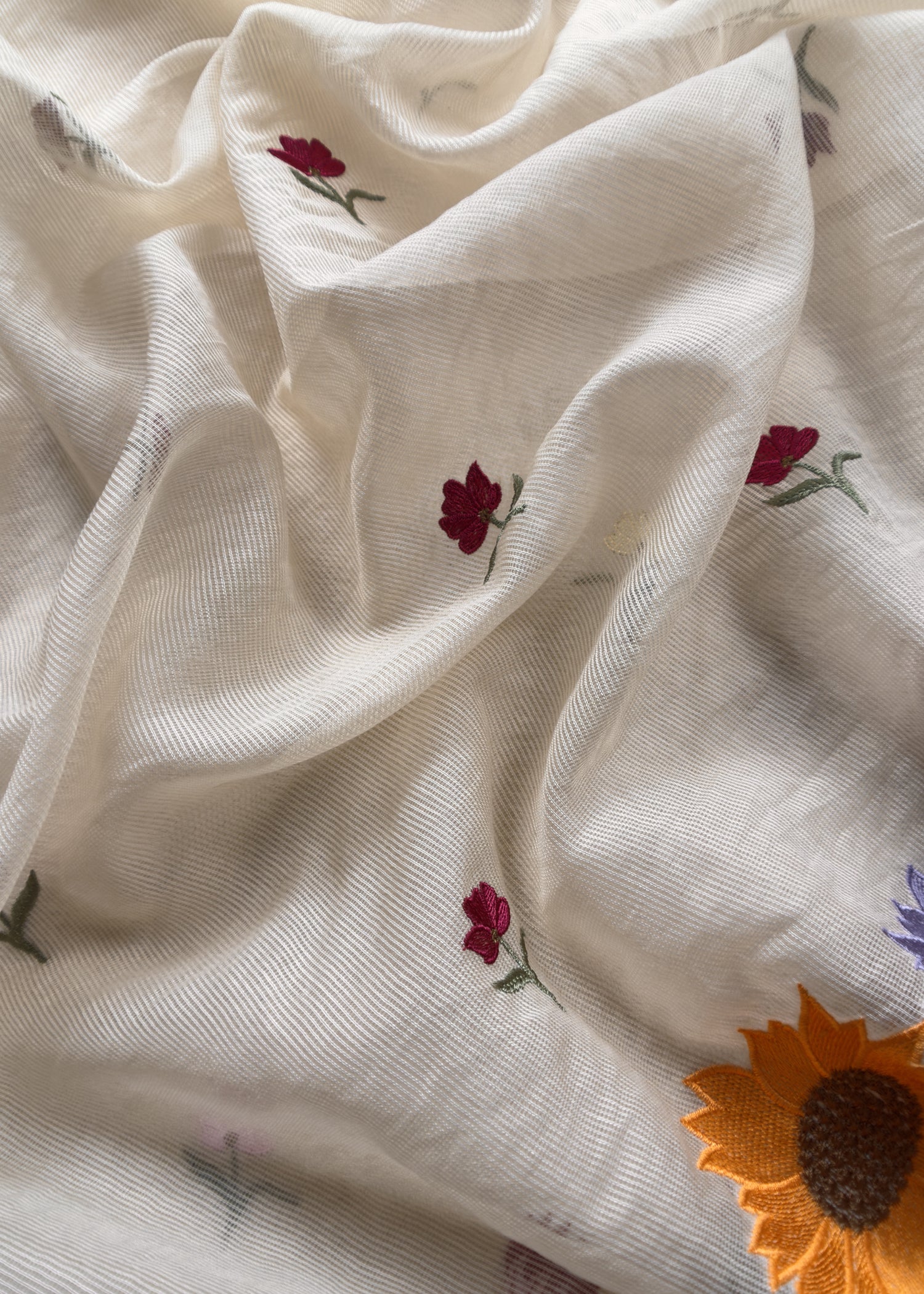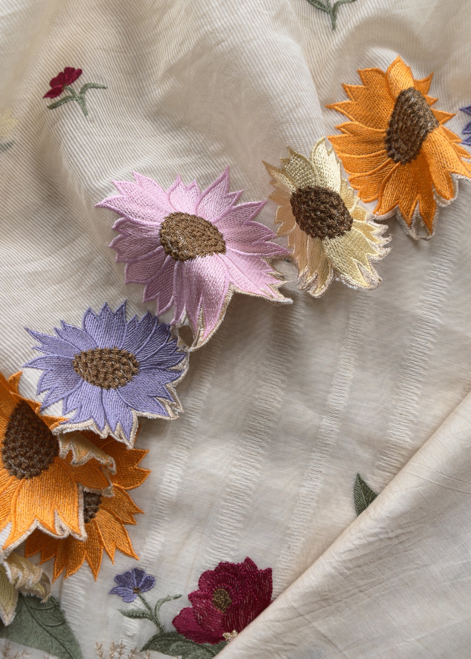 Shop this premium pure cotton kurta in a self-design, beautifully adorned with multicolour floral embroidery on the ghera. It is paired with a soft Kota dupatta featuring embroidered bootis and floral motifs, and comes with a plain muslin cotton bottom for a graceful and comfortable look.