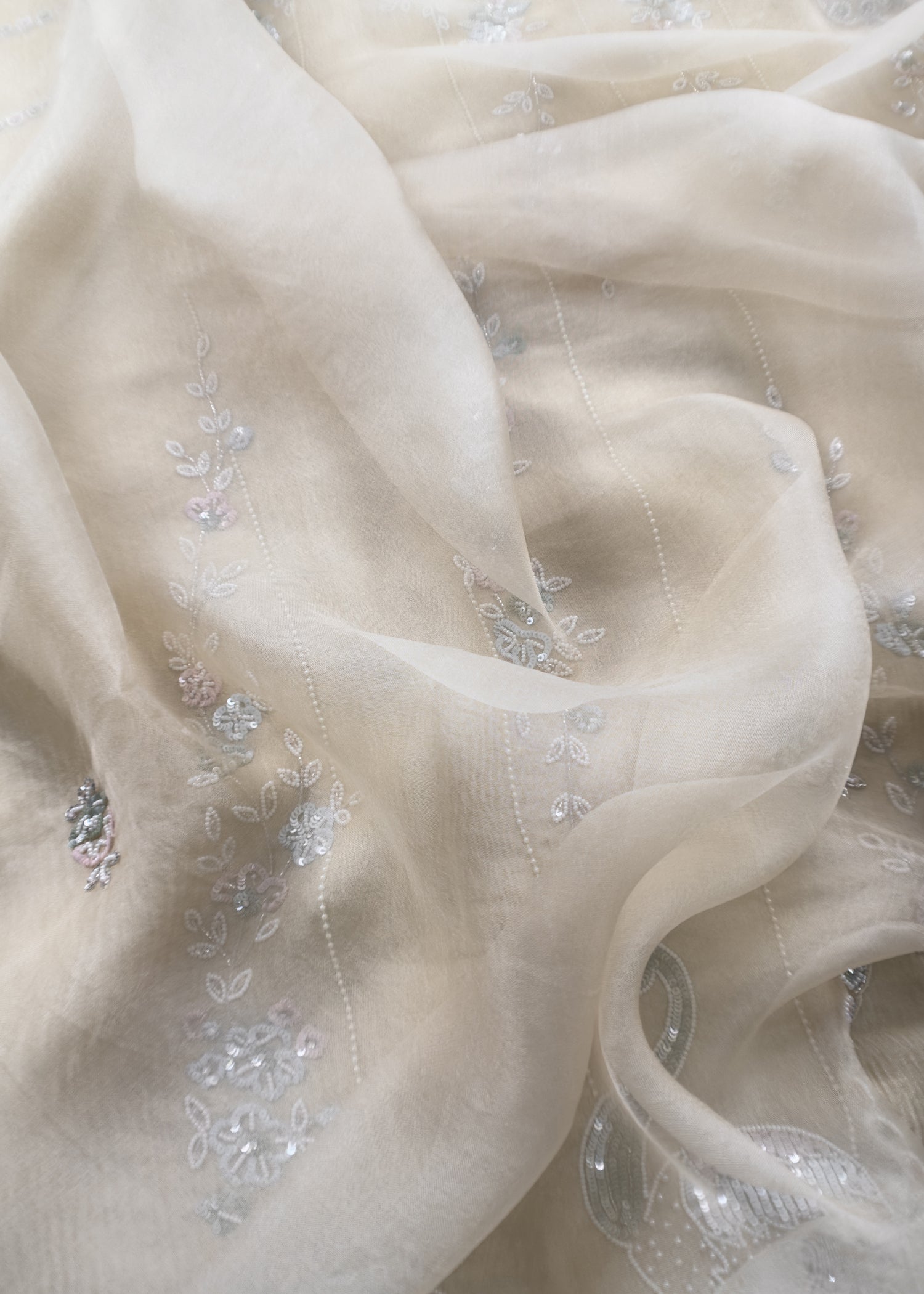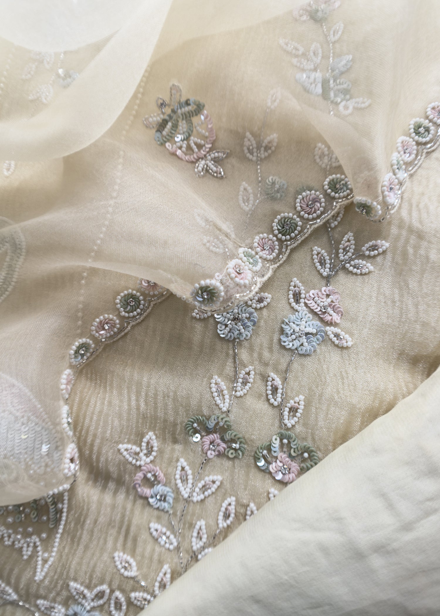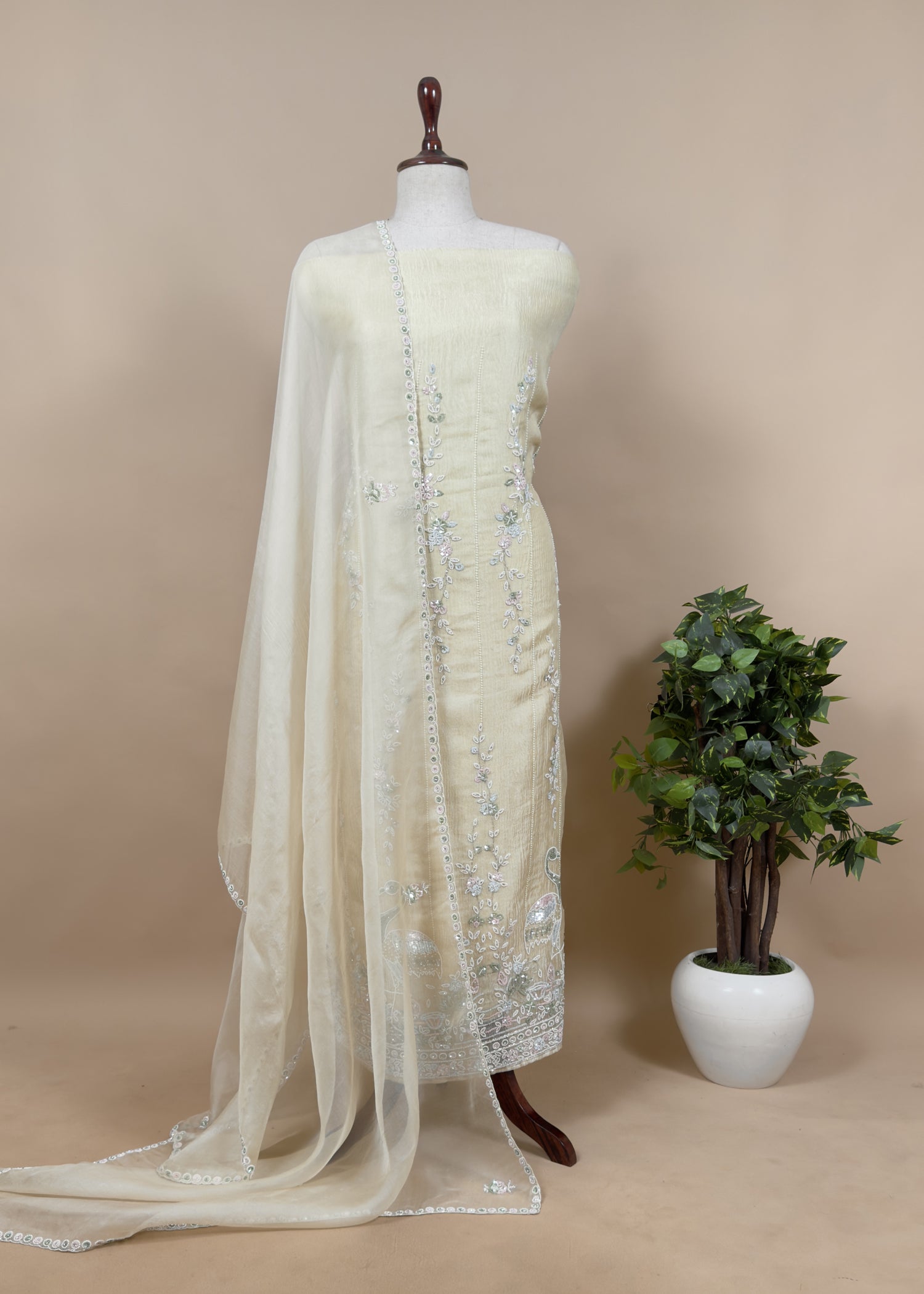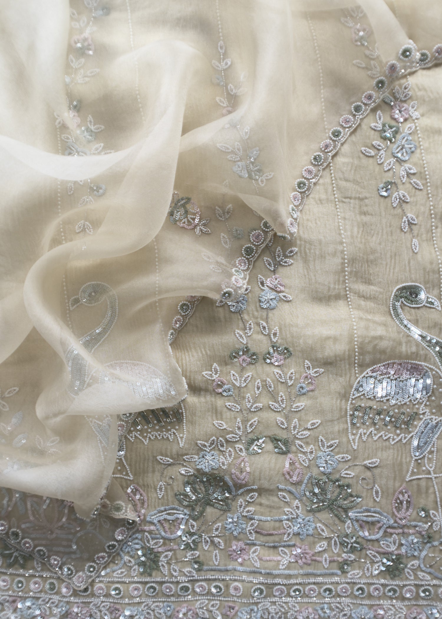 Unstitched handloom tissue silk kurta features intricate cutdana, beaded and sequins work in floral vertical patterns on the front yoke and mesmerizing hand embroidered swans on the daman.