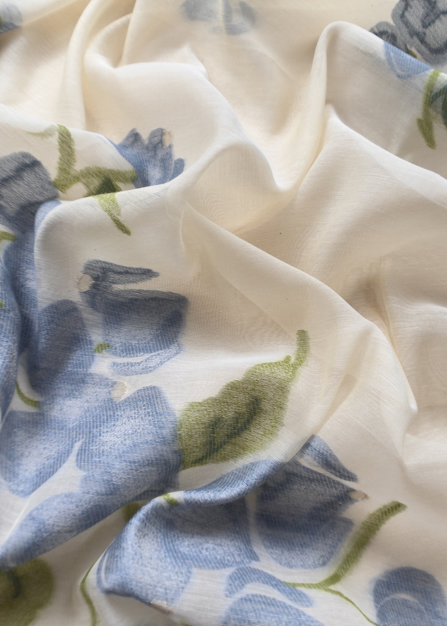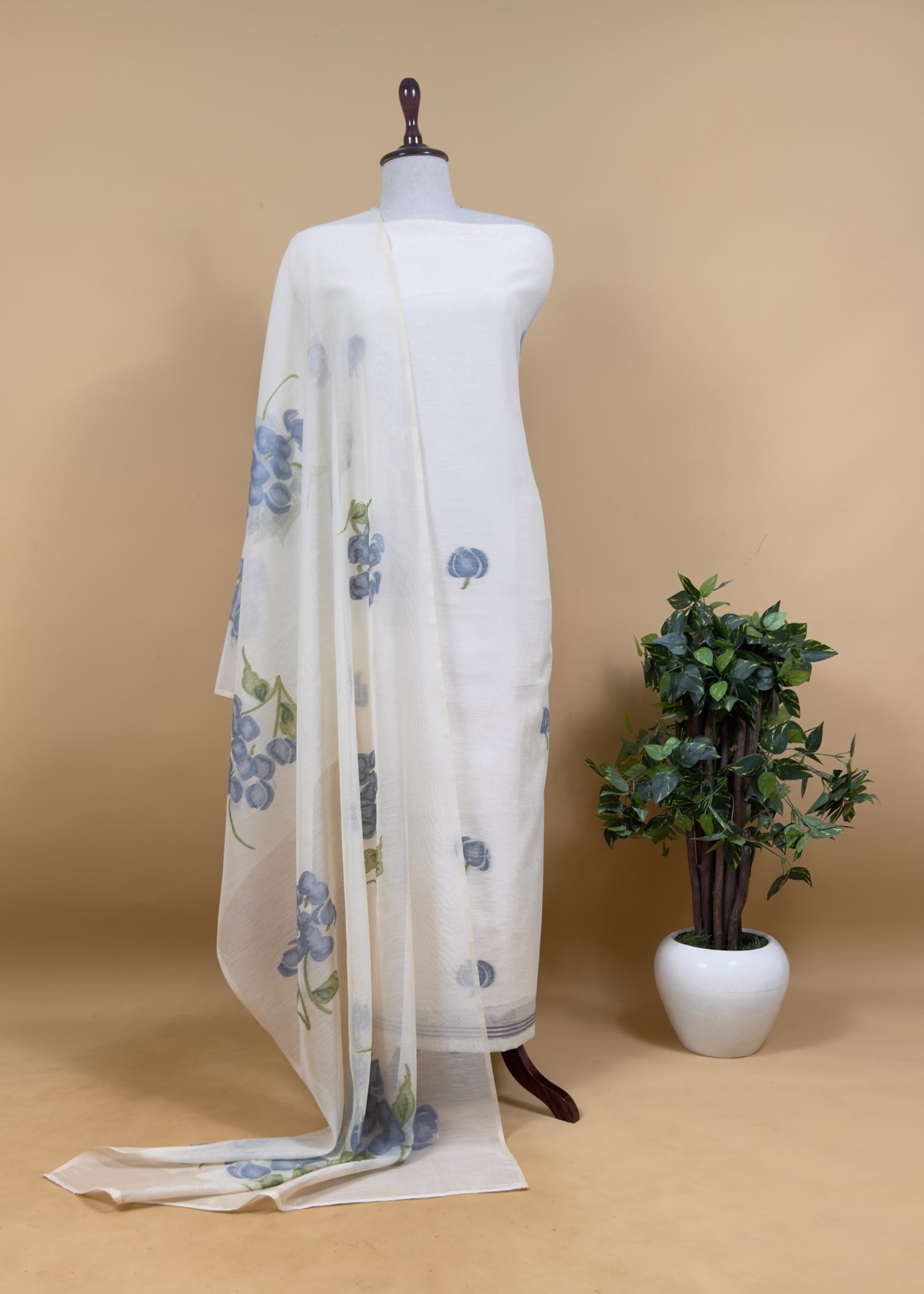 Off White Jamdani Suit With Blue Daffodil In Linen Chanderi Fabric