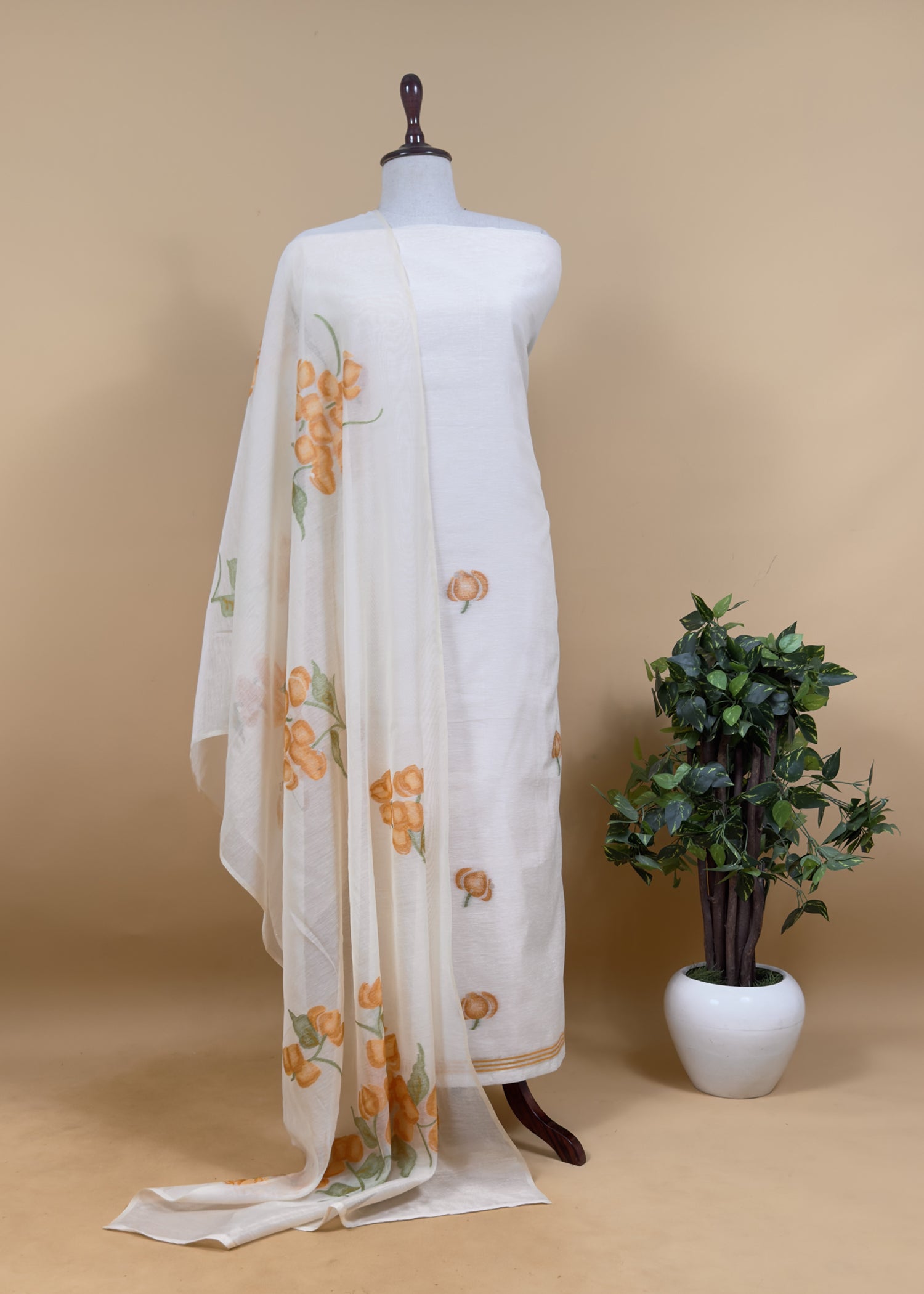 Shop our exclusive Daffodil Jamdani suits in linen Chanderi fabric, paired with a beautiful mul dupatta.