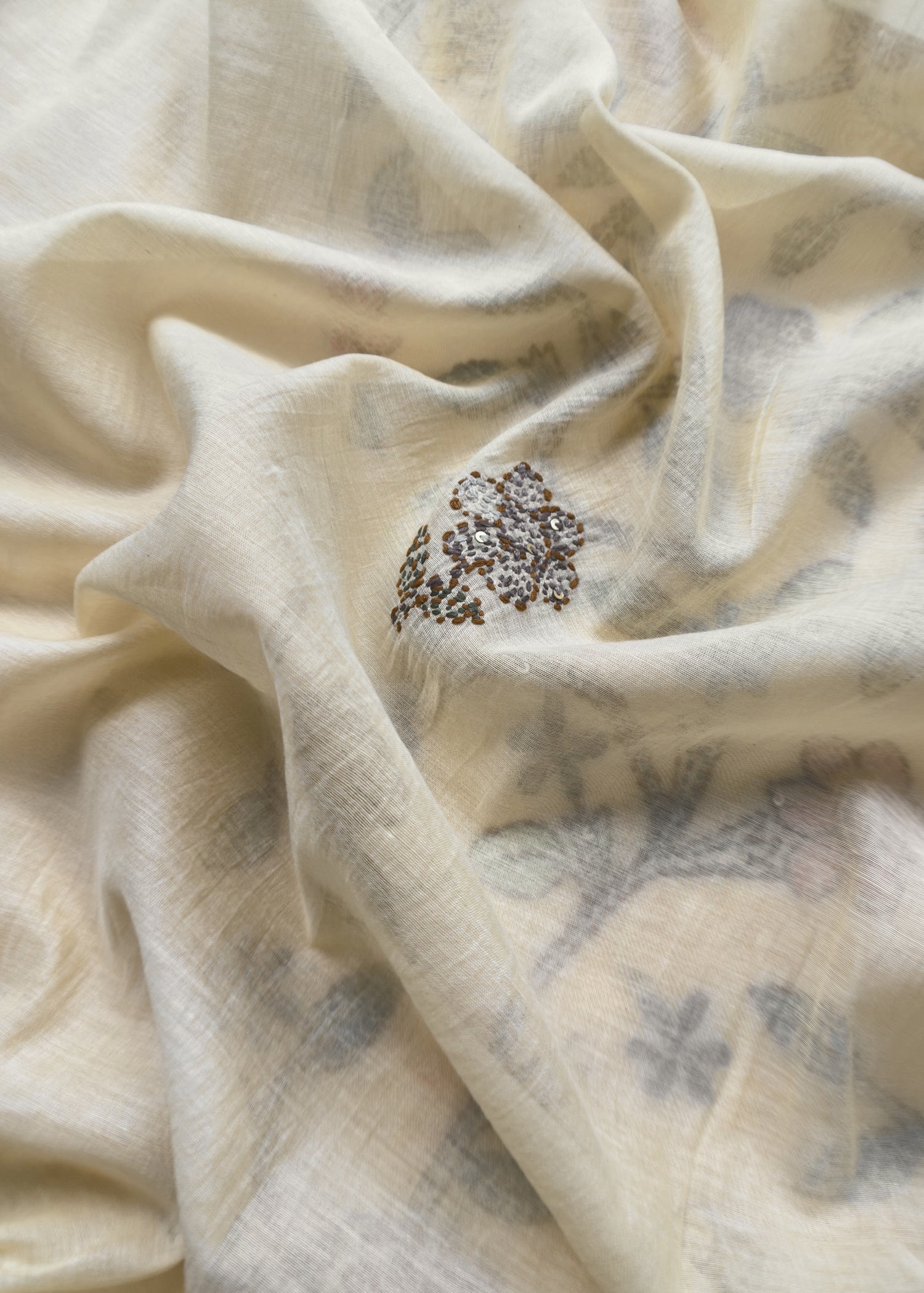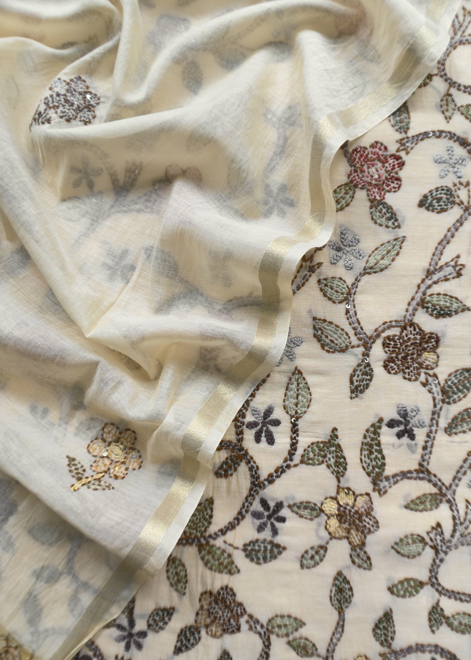 Off White Kantha Embroidered Suit In Pure Mul Chanderi