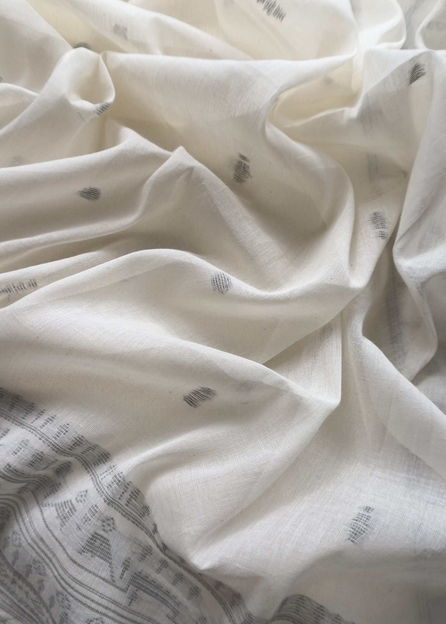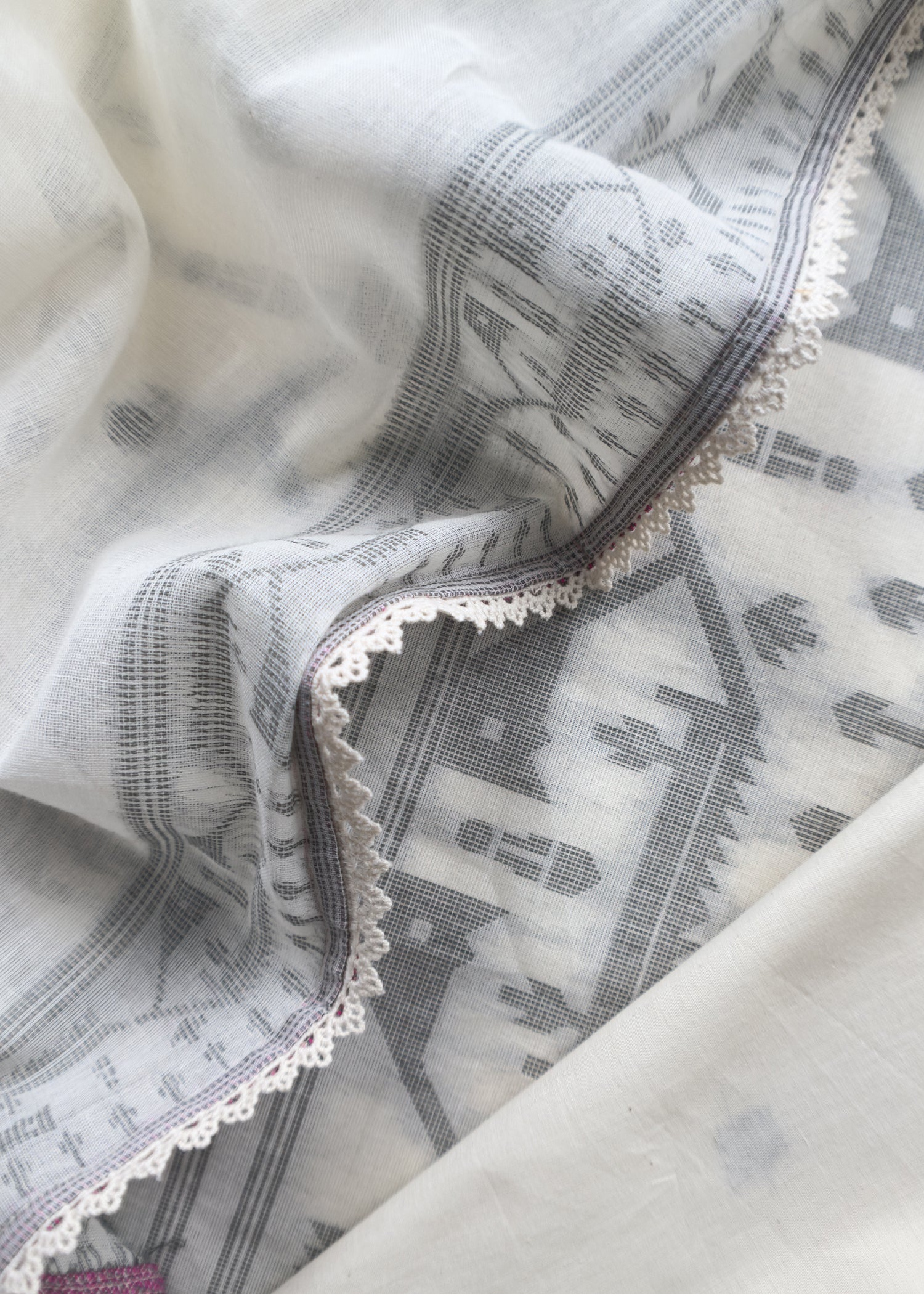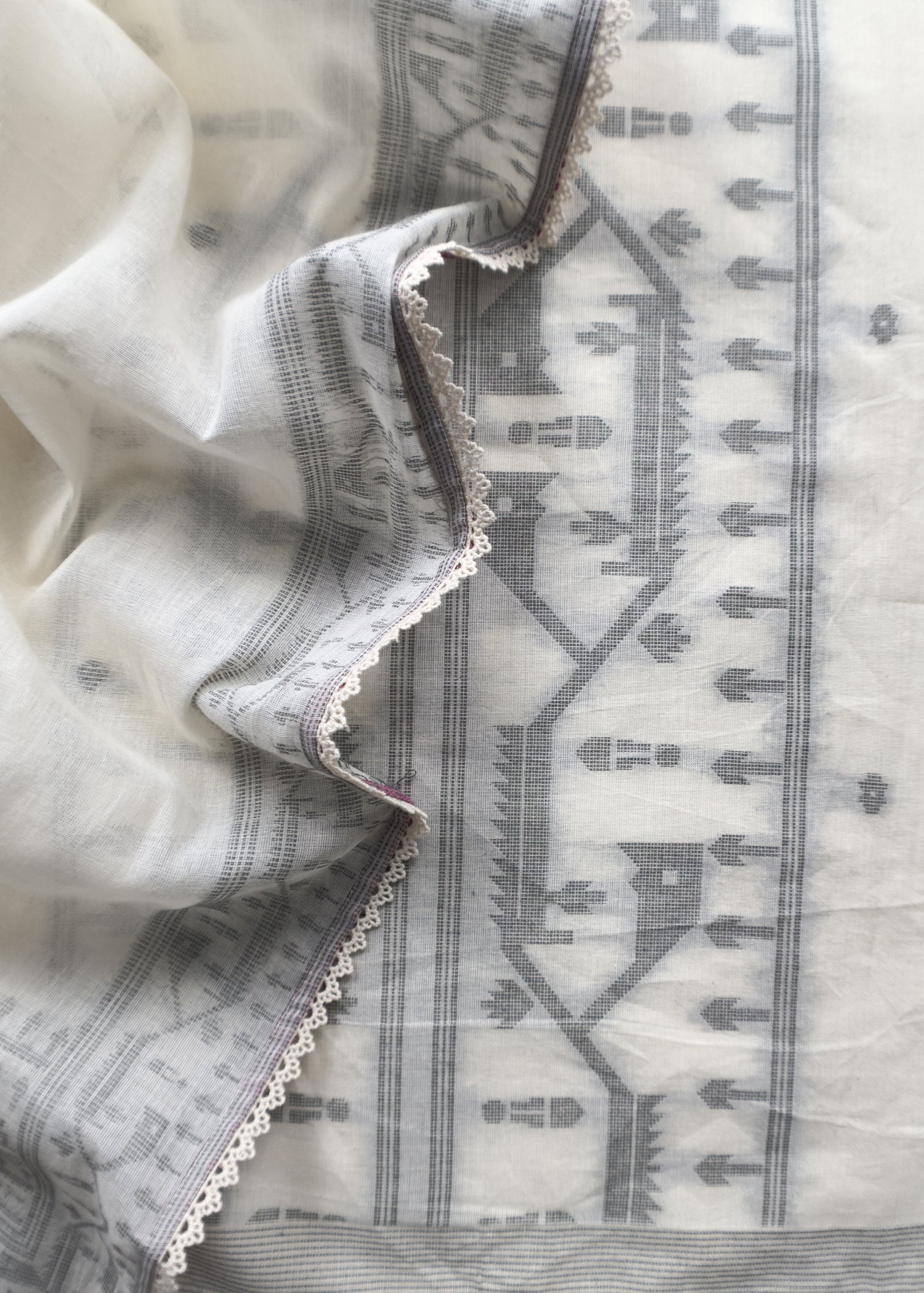 Celebrate Indian craftsmanship with our summers fav cotton linen suits on beautiful off white base with tradition hand block printing and Jamdani weaving on kurta and dupatta. The three-piece suit comes with plain matching cotton satin lowers.