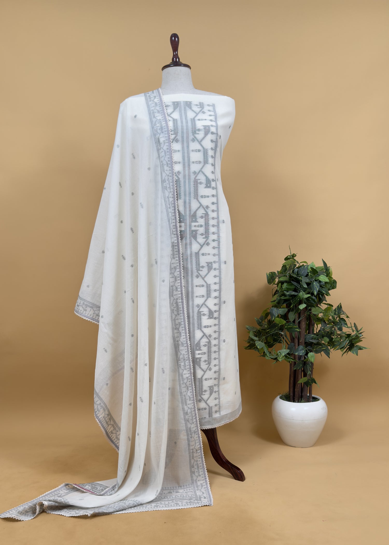 Off-White Pure Cotton Linen Hand Block Print Suit Fabric With Jamdani Weaving