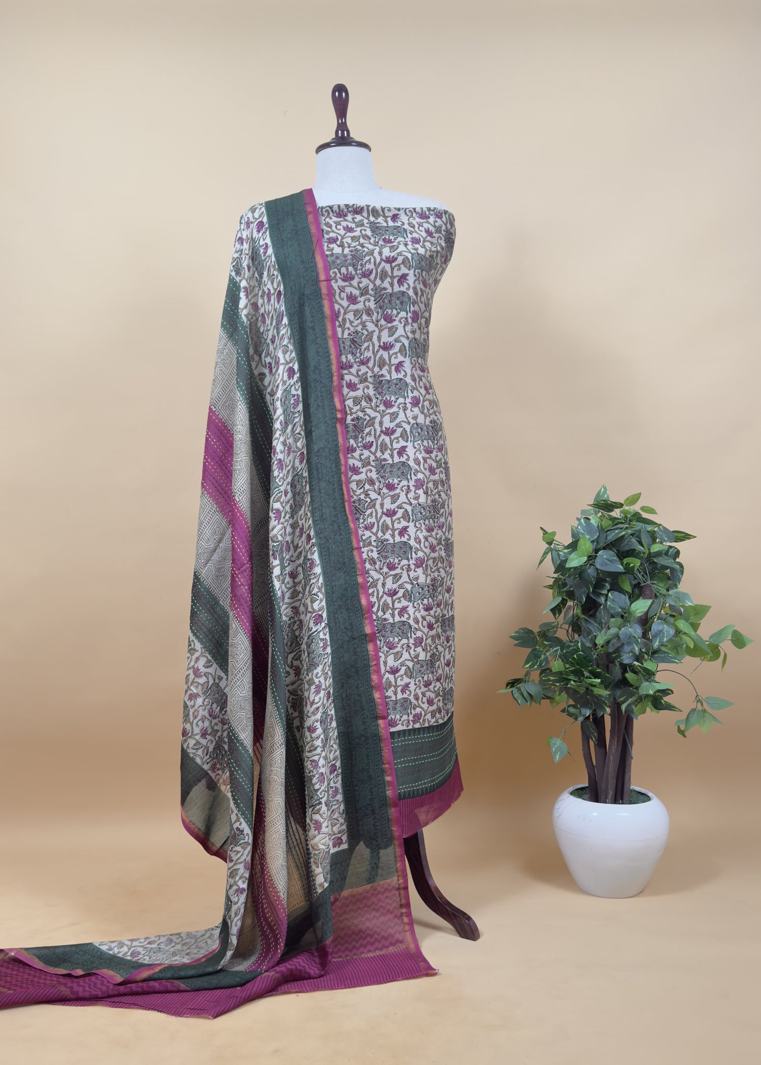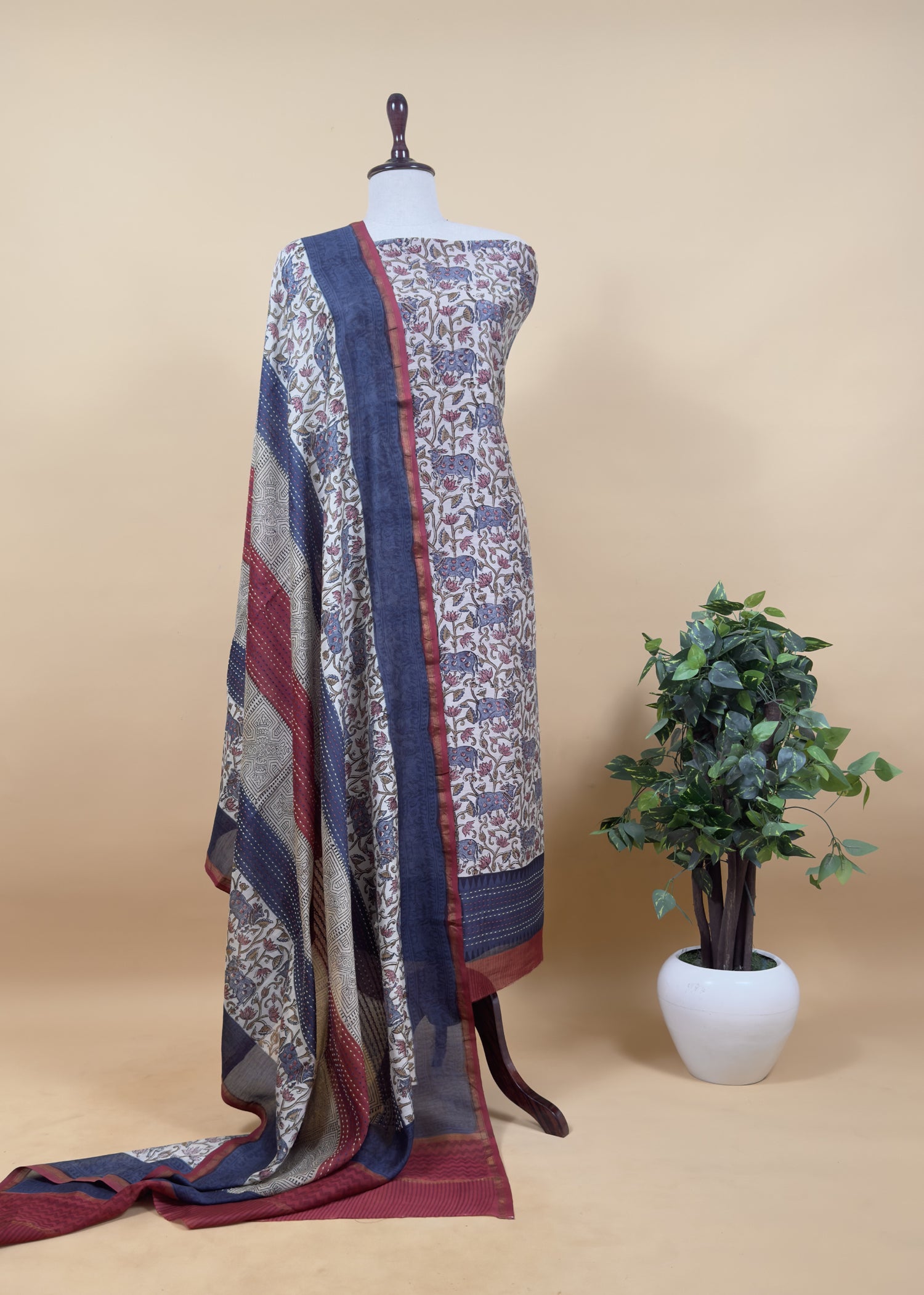 Off White With Maroon Handloom Maheshwari Silk Suit With Pichwai Print And Kantha Work