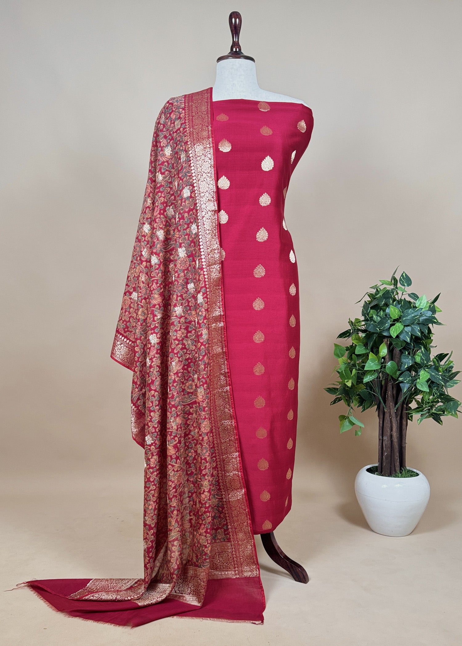 Banarasi Unstitched Suit In Chanderi adorned with exquisite Zari Bootis, paired flawlessly with a mesmerizing Kalamkari Dupatta and Plain bottom.
