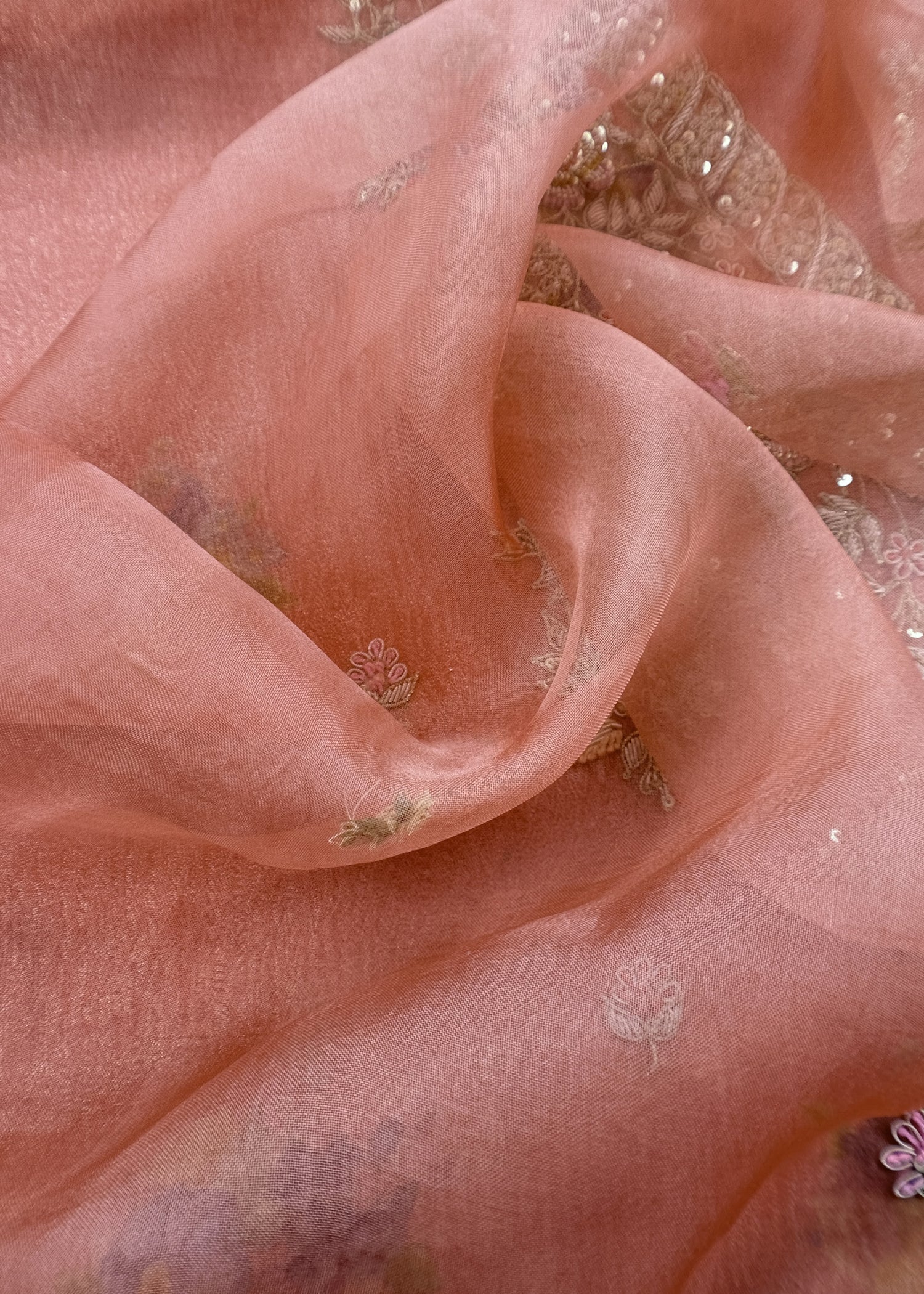 The suit comes with pure tissue silk lured dupatta with beaded scalloping and phool bootis. Perfect for weddings, summer celebrations, trousseau collection and upcoming festive occasions.