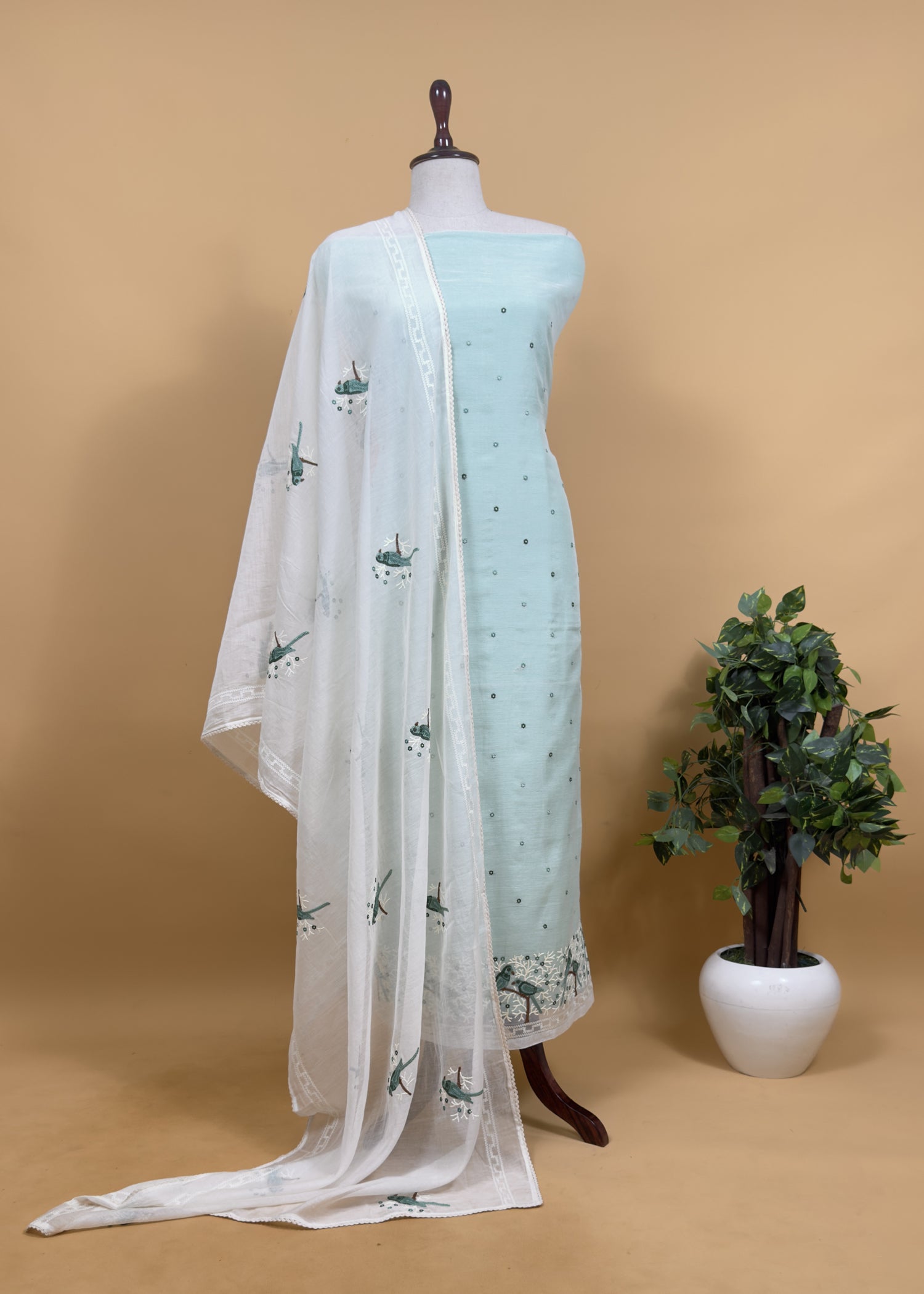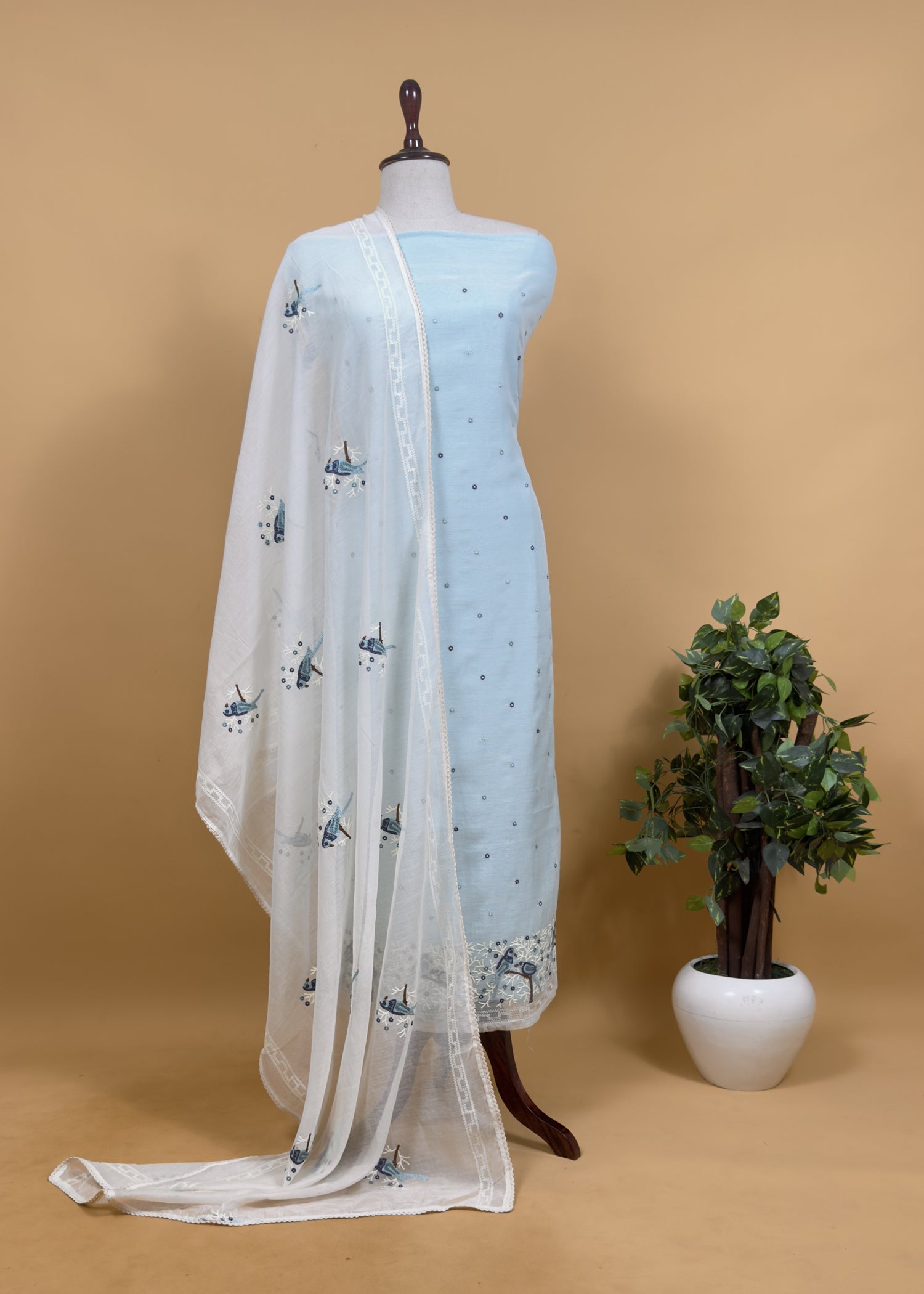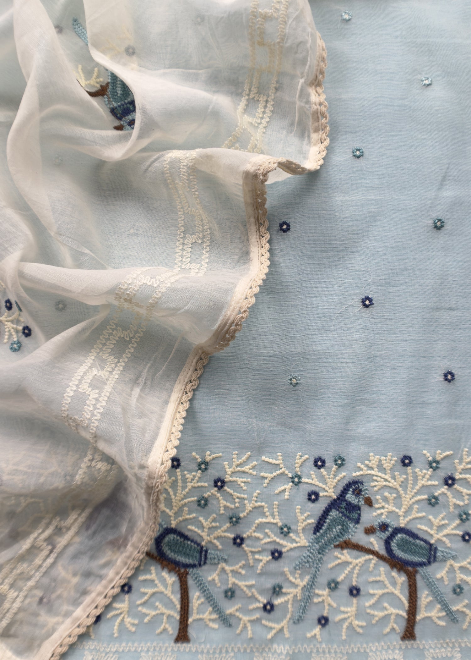 Pastel Blue Pure Mul Chanderi Suit with Chidiya French Thread Embroidery