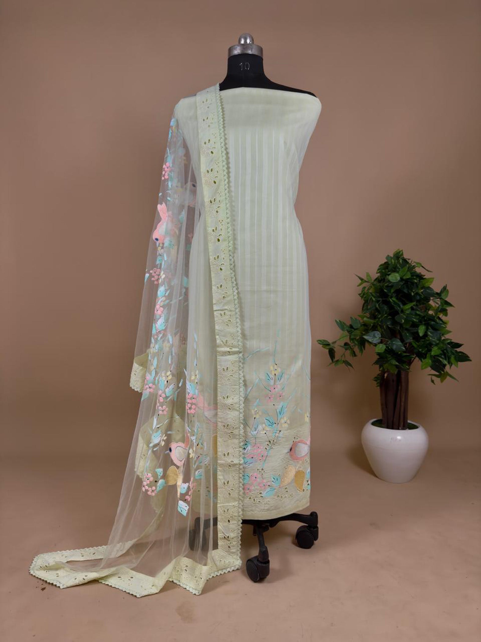 Pastel Green Unstitched Cotton Suit With Criss-Cross Embroidery