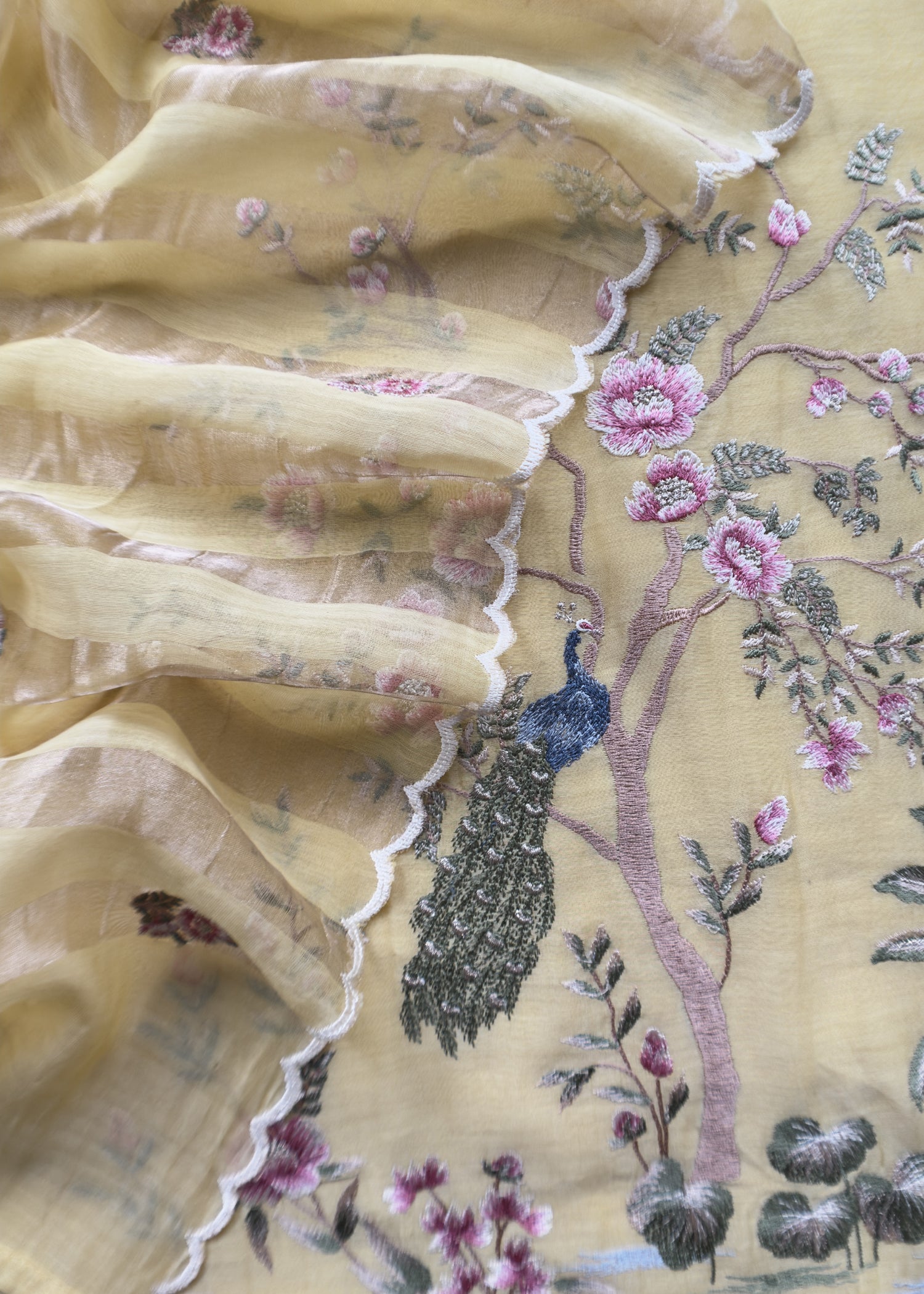 Shop the prettiest summer mul kurta adorned with beautiful flower, trees and peacock Resham bharwa embroidery with zari detailings paired with scalloped pure mul dupatta with zari stripes, phoot bootis and handmade tassels. The suit comes with matching pure cotton satin lowers.