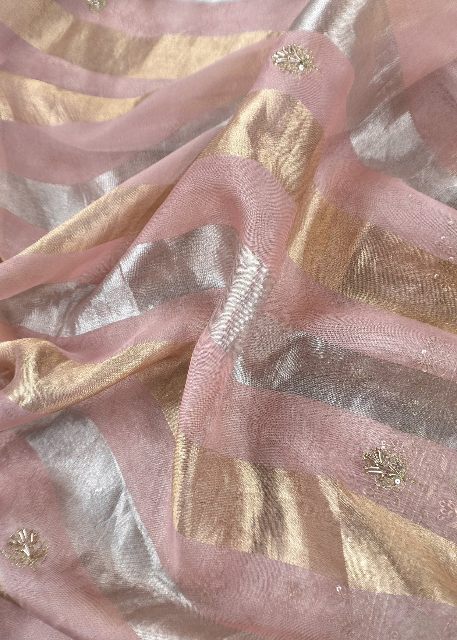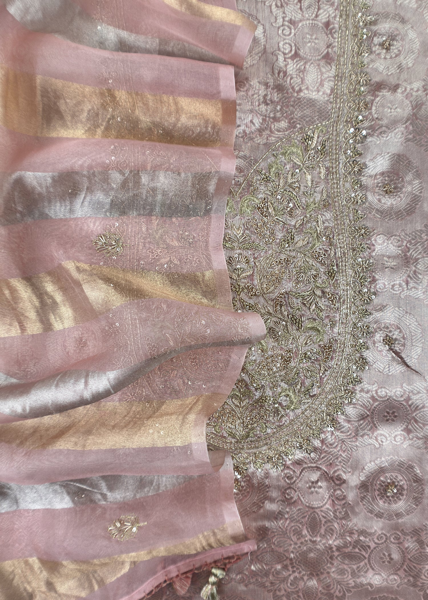 Peach Handloom Brocade Tissue Silk Suit With Dabka, Dori, Zardosi Handwork