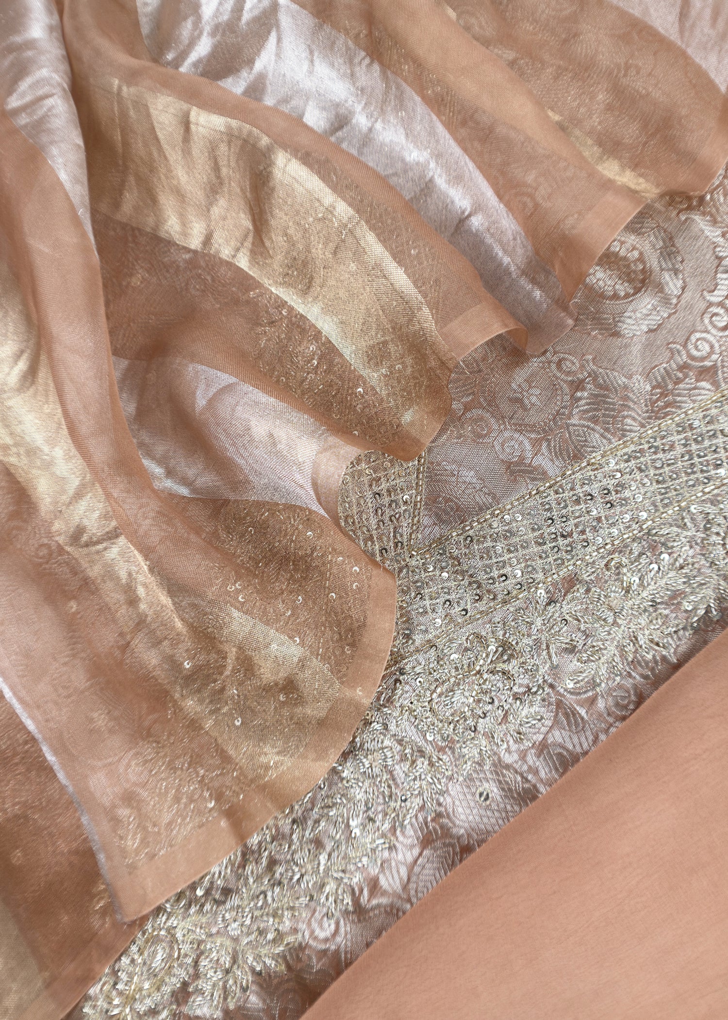 Peach Varanasi Brocade Silk Kurta And Double Panel Tissue Dupatta With Handwork