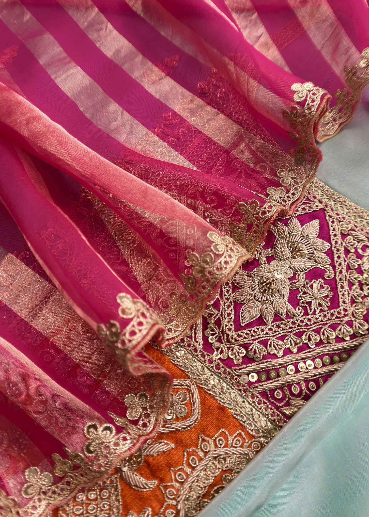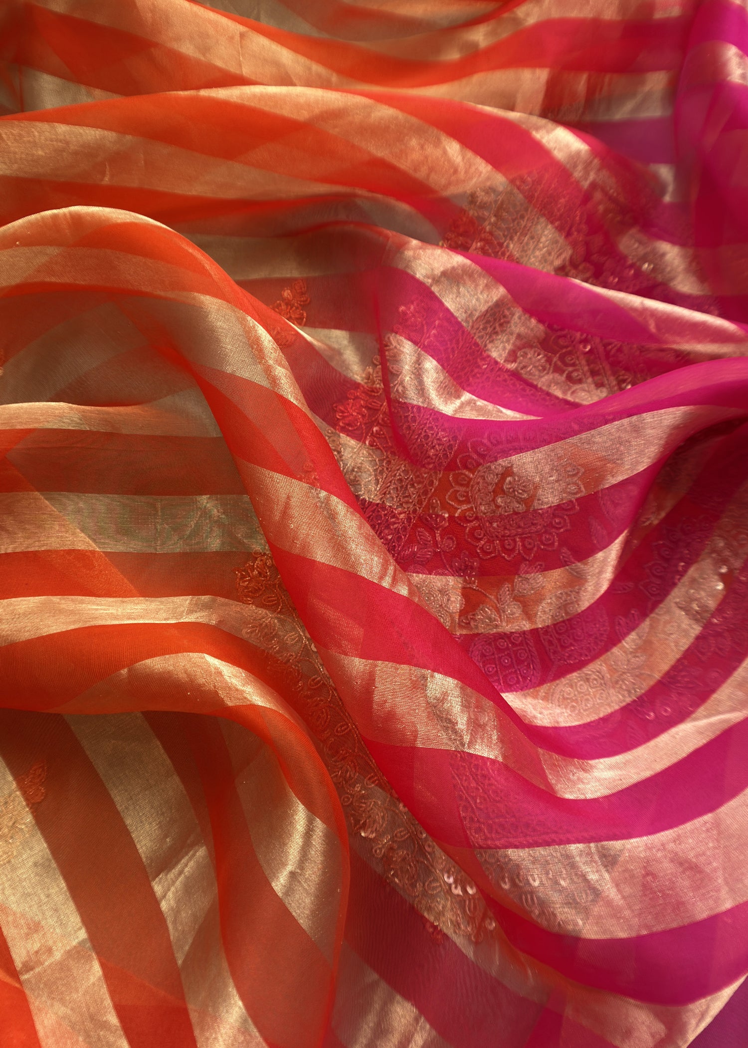 The designer dupatta is in tissue silk with gold zari panels with hand embroidered small scalloped borders in orange Rani ombré shades. The suit comes with matching crepe silk lowers.