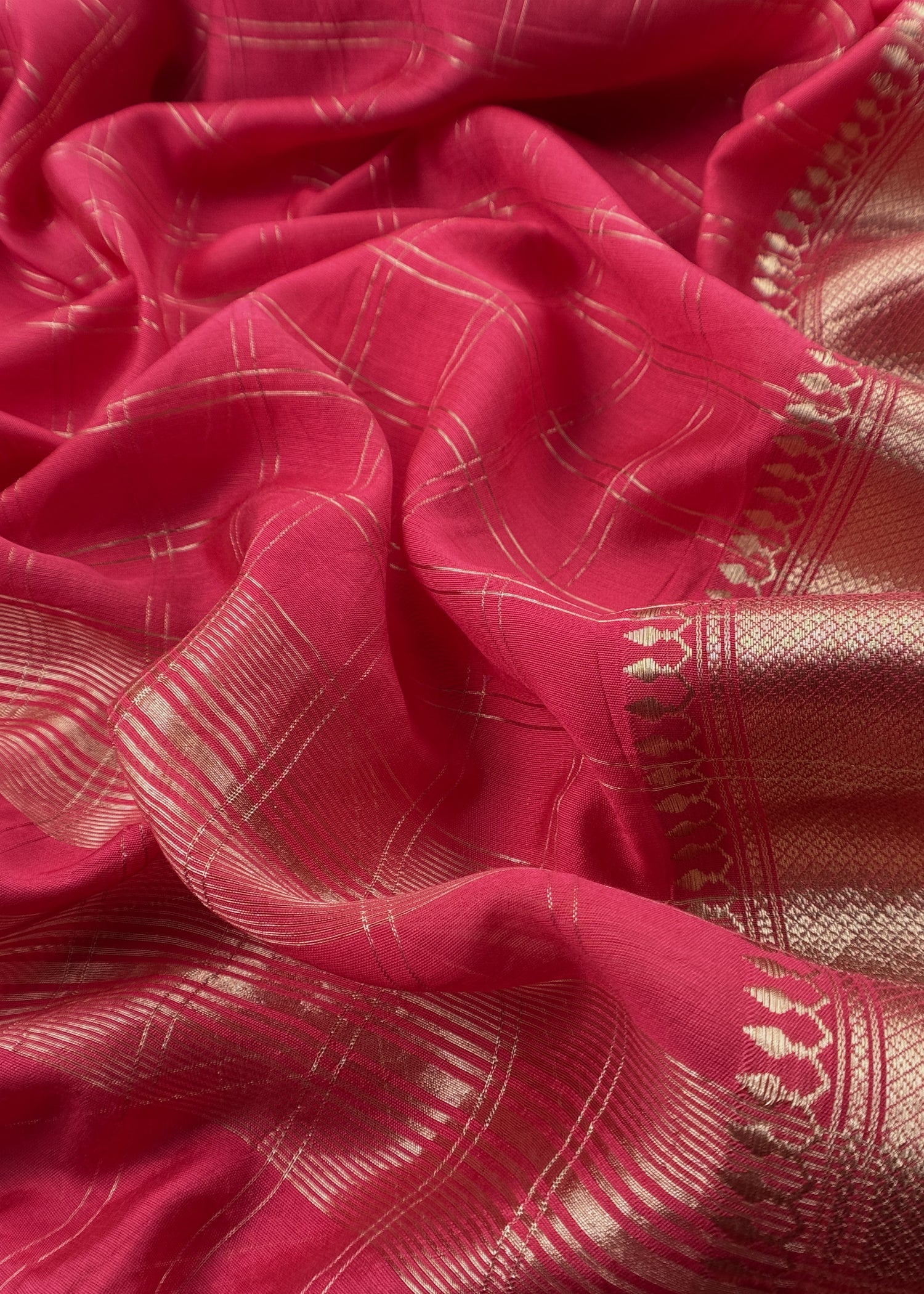 Shop gorgeous Banarasi suit in Chanderi silk kurta with check gold weaving paired with dupatta adorned with elegant Banarasi Zari border. The unstitched three piece suit fabric comes with matching cotton silk lowers.