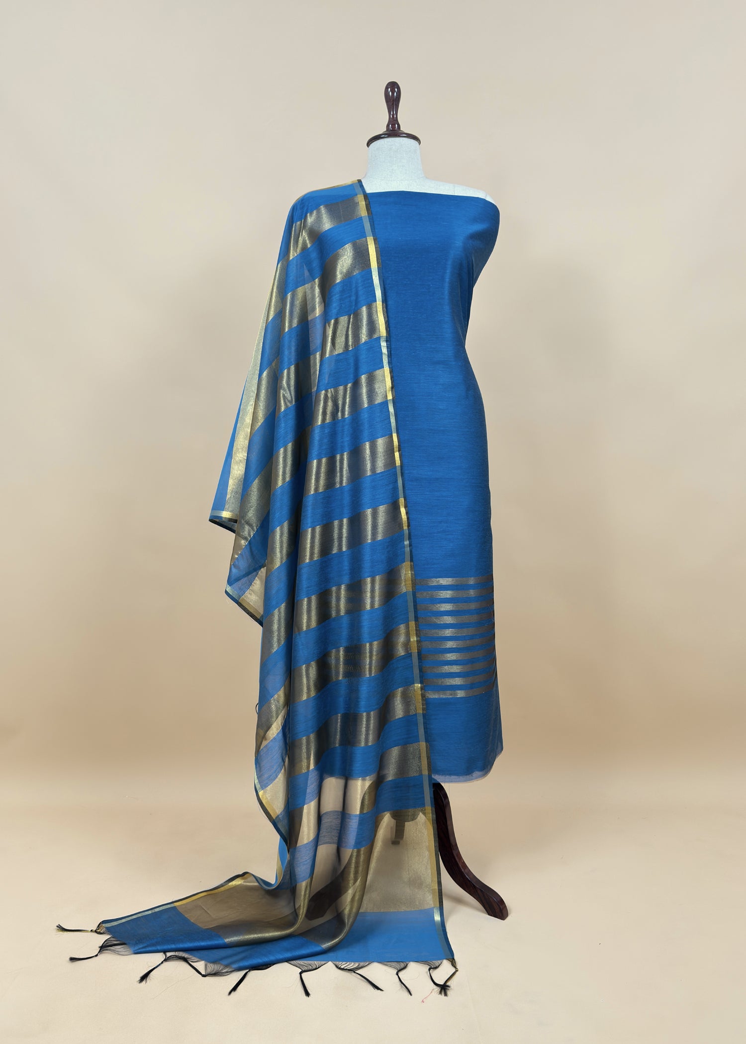 Shop gorgeous Banarasi chanderi is embraced with fine gold zari weaving on the ghera of kurta with panel dupatta adorned with elegant Banarasi Zari work . The unstitched three piece suit fabric comes with matching cotton silk lowers.