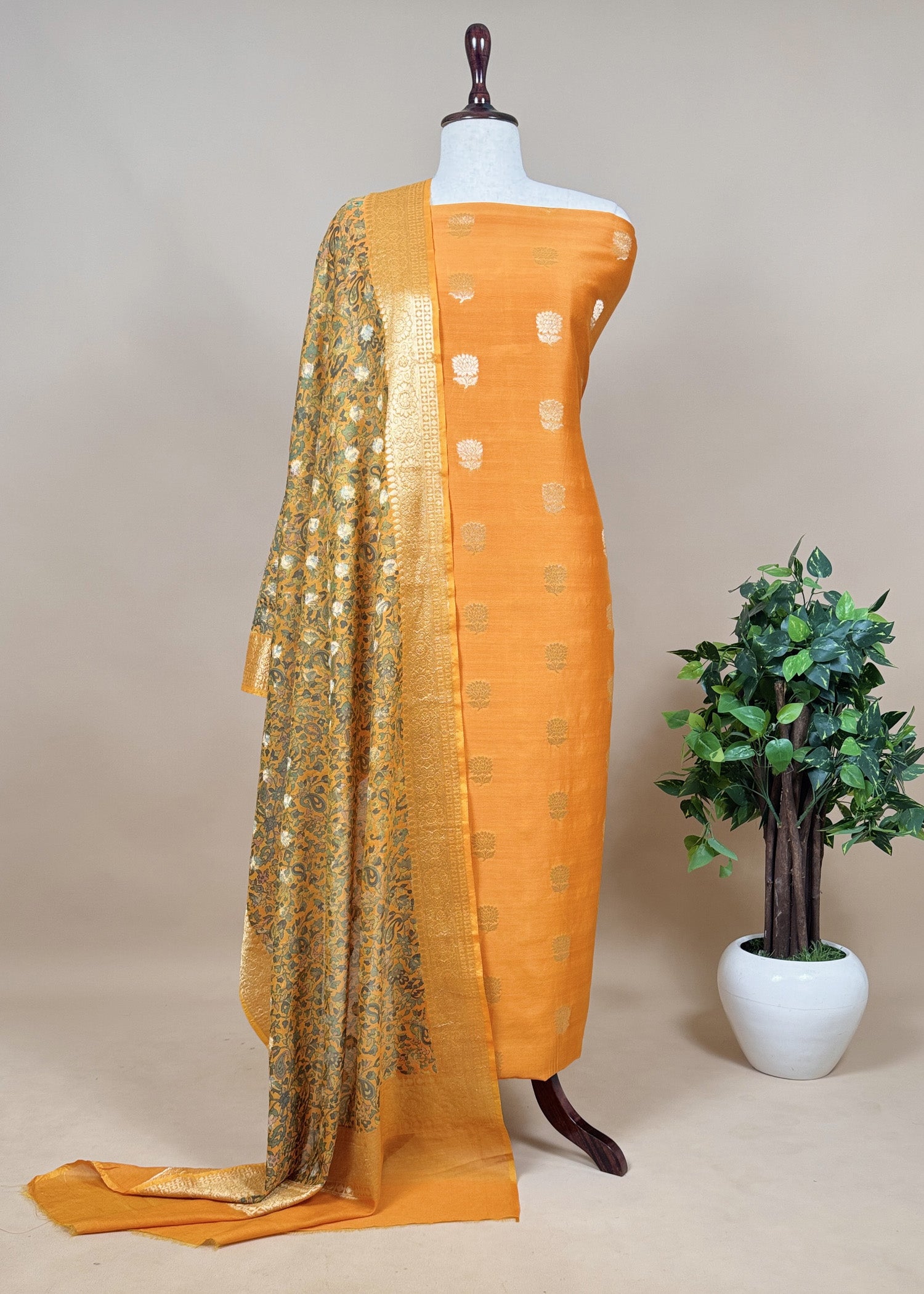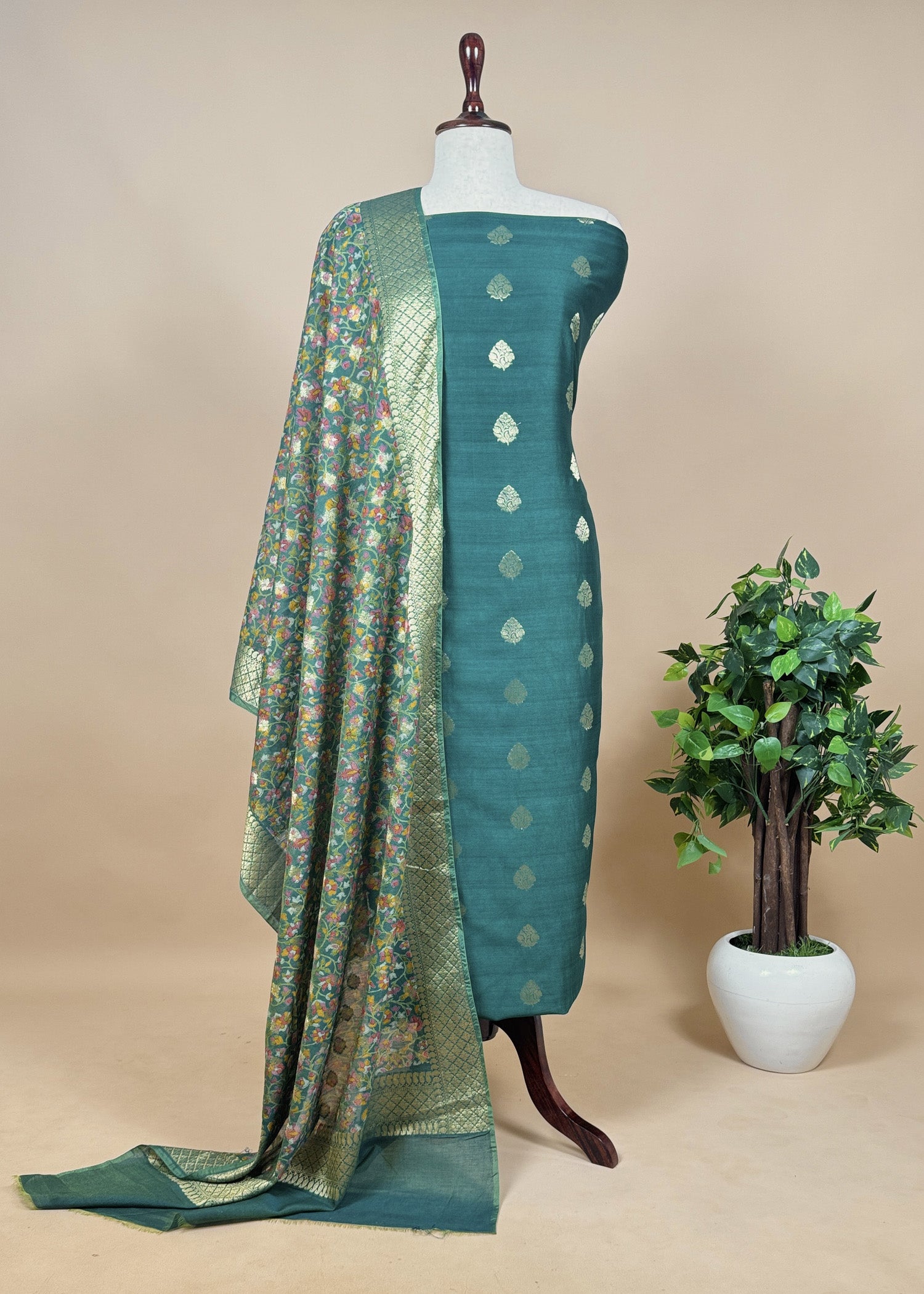 Banarasi Unstitched Suit In Chanderi adorned with exquisite Zari Bootis, paired flawlessly with a mesmerizing Kalamkari Dupatta and Plain bottom.