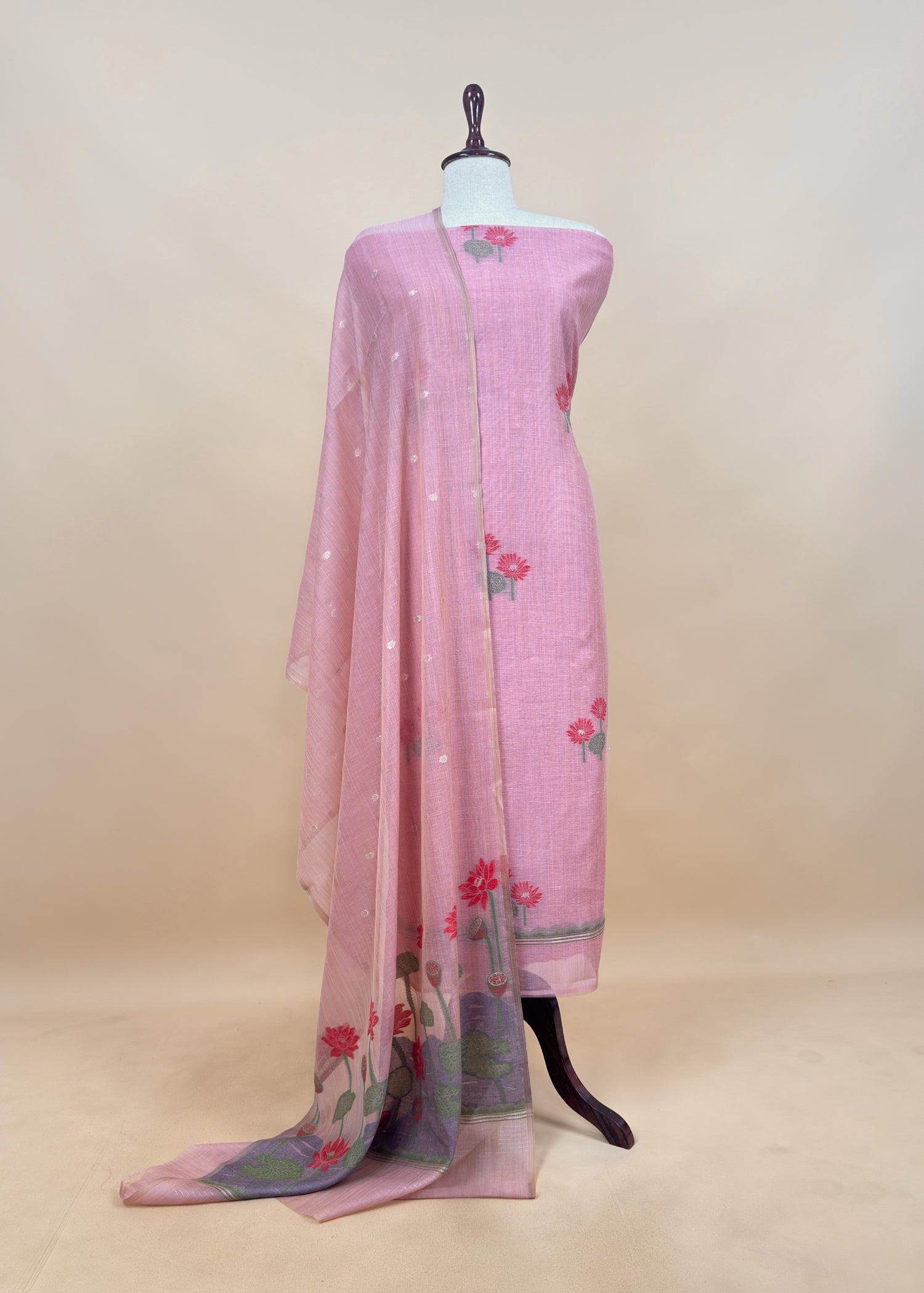 Pink Floral Jamdani Weave Unstitched Chanderi Suit