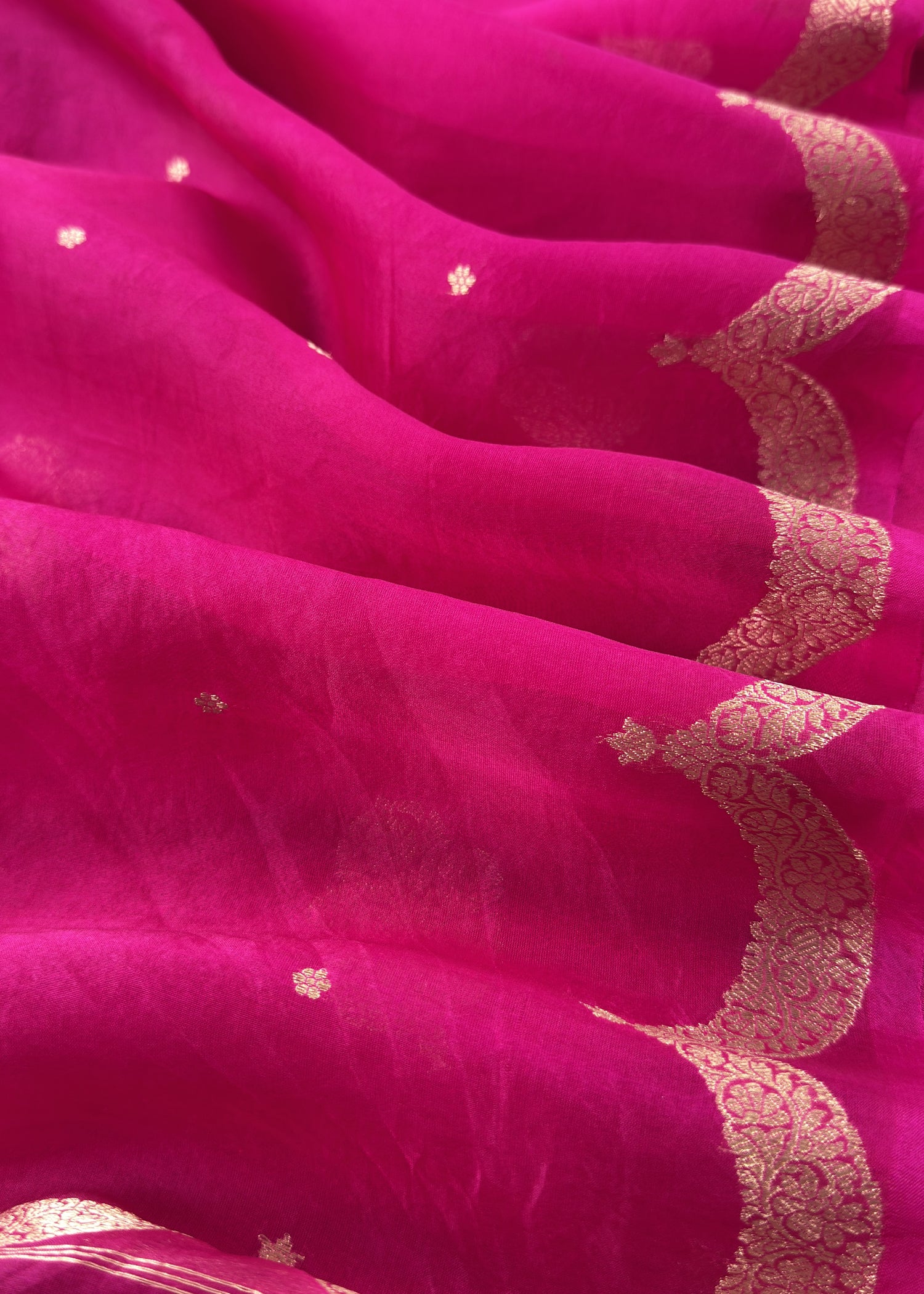 Handloom silk kurta with kadwa meenakari gold zari woven phool bootis paired with matching pure silk lowers comes with ombré laal Rani pure kora silk dupatta with diagonal woven panels.