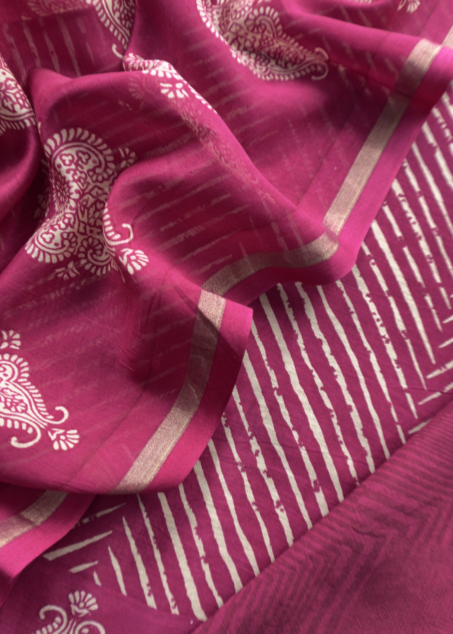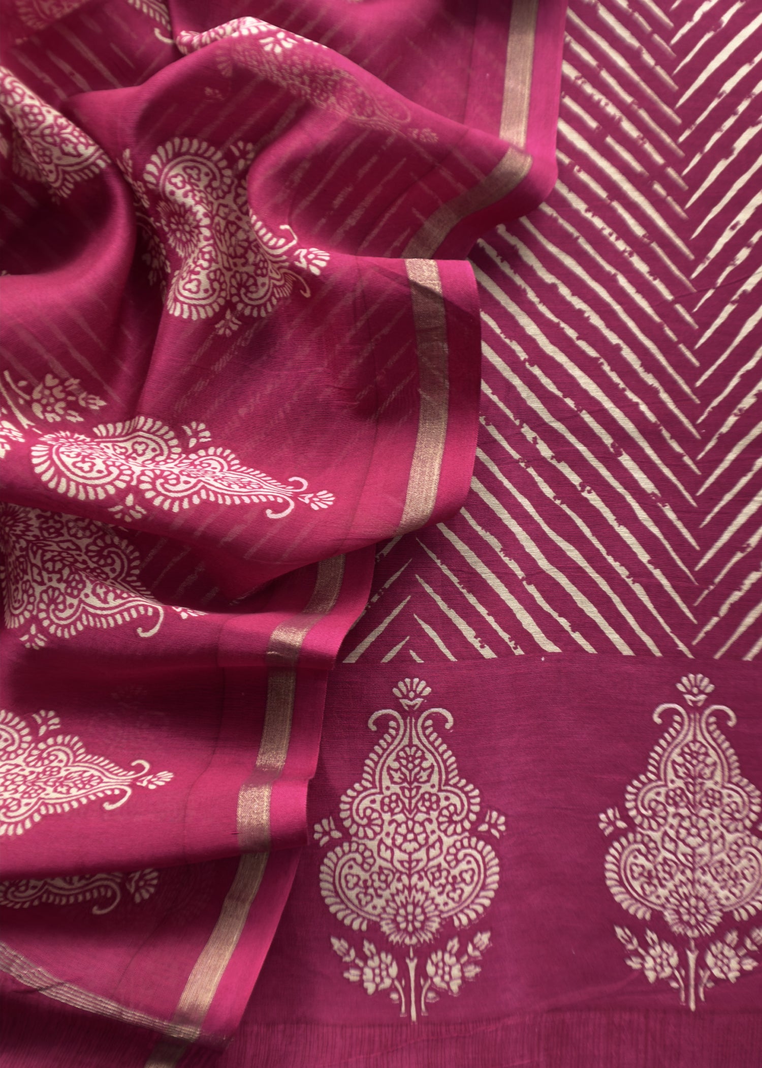 Pink Maheshwari Silk Unstitched Suit With Leheriya And Block Print