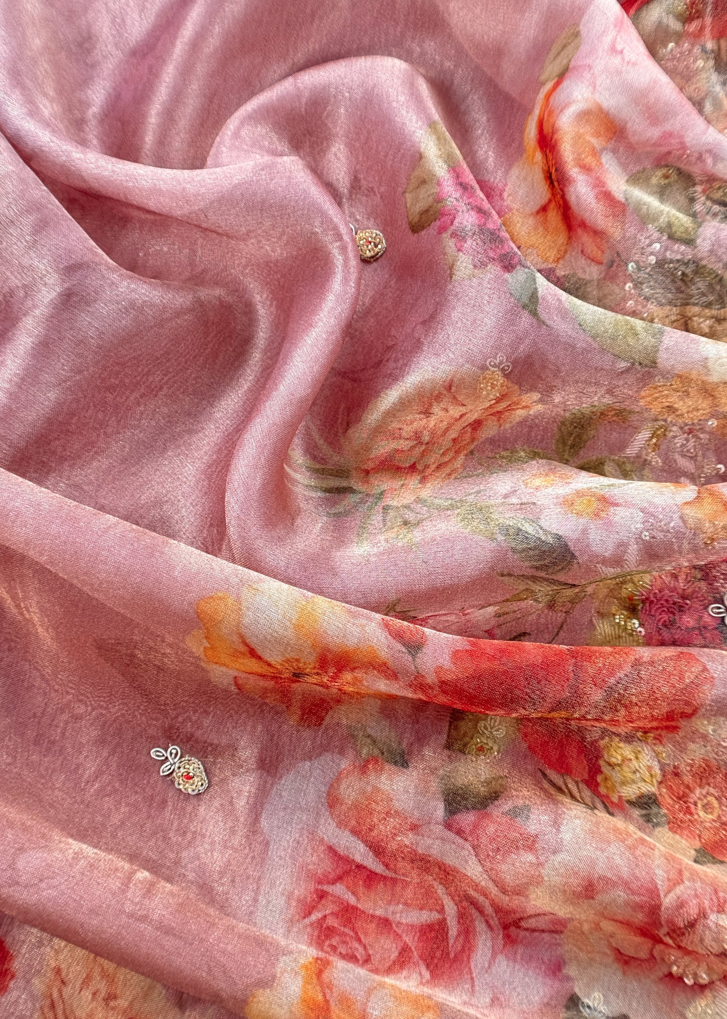 orgeous pure crushed tissue silk kurta with beautiful neckline made by delicate dabka, Dori, zardosi handwork paired with tissue silk dupatta with lovely brush print and handwork bootis. The suit comes with matching crepe silk lowers.