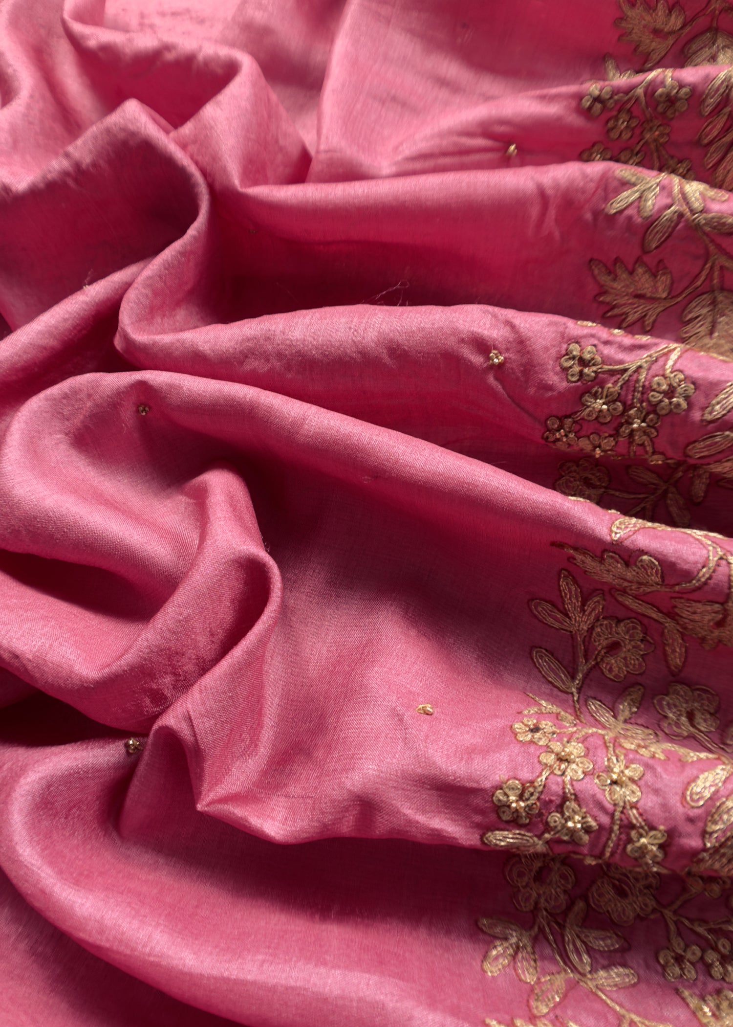 Pink Pure Tussar Unstitched Suit With Aari Embroidery