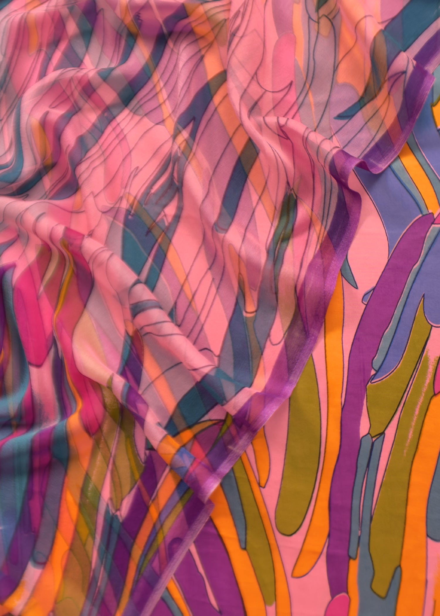 A pure crepe suit with mesmerizing digital prints on the kurta, paired with a chinon dupatta and a pure crepe bottom.