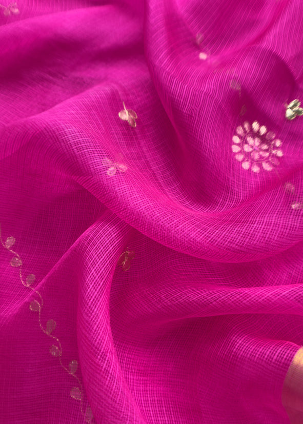 Get your hands on this kurta and dupatta set in pure Kota Doria silk fabric, adorned with traditional hand Gotta Patti work on the kurta and all over the dupatta. This elegant three-piece suit comes with a matching bottom.