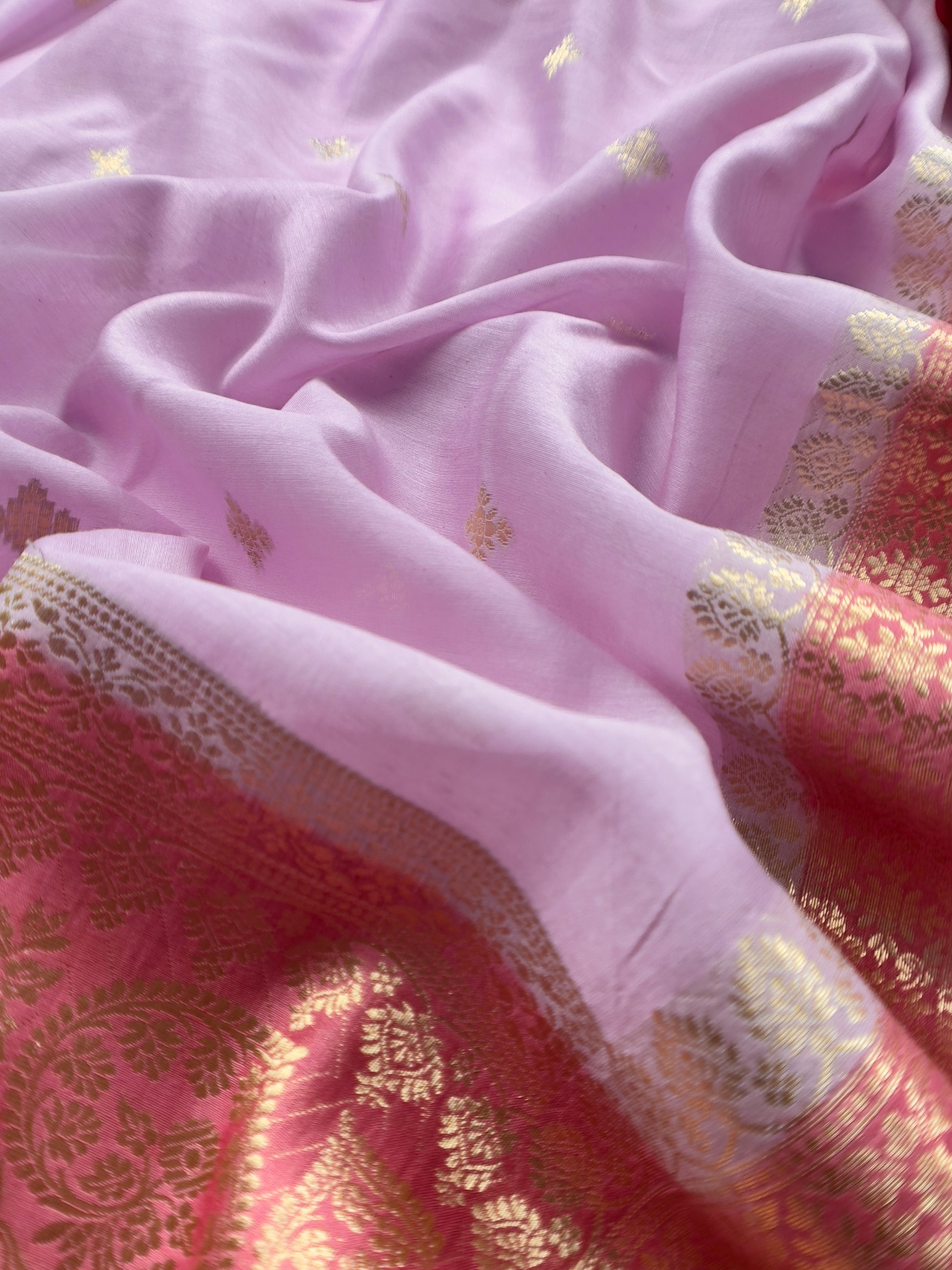 Shop gorgeous pastel kurta and dupatta in pure silk adorned with woven, elegant bootis and Banarasi zari borders. The unstitched three piece suit fabric comes with matching cotton silk lowers.