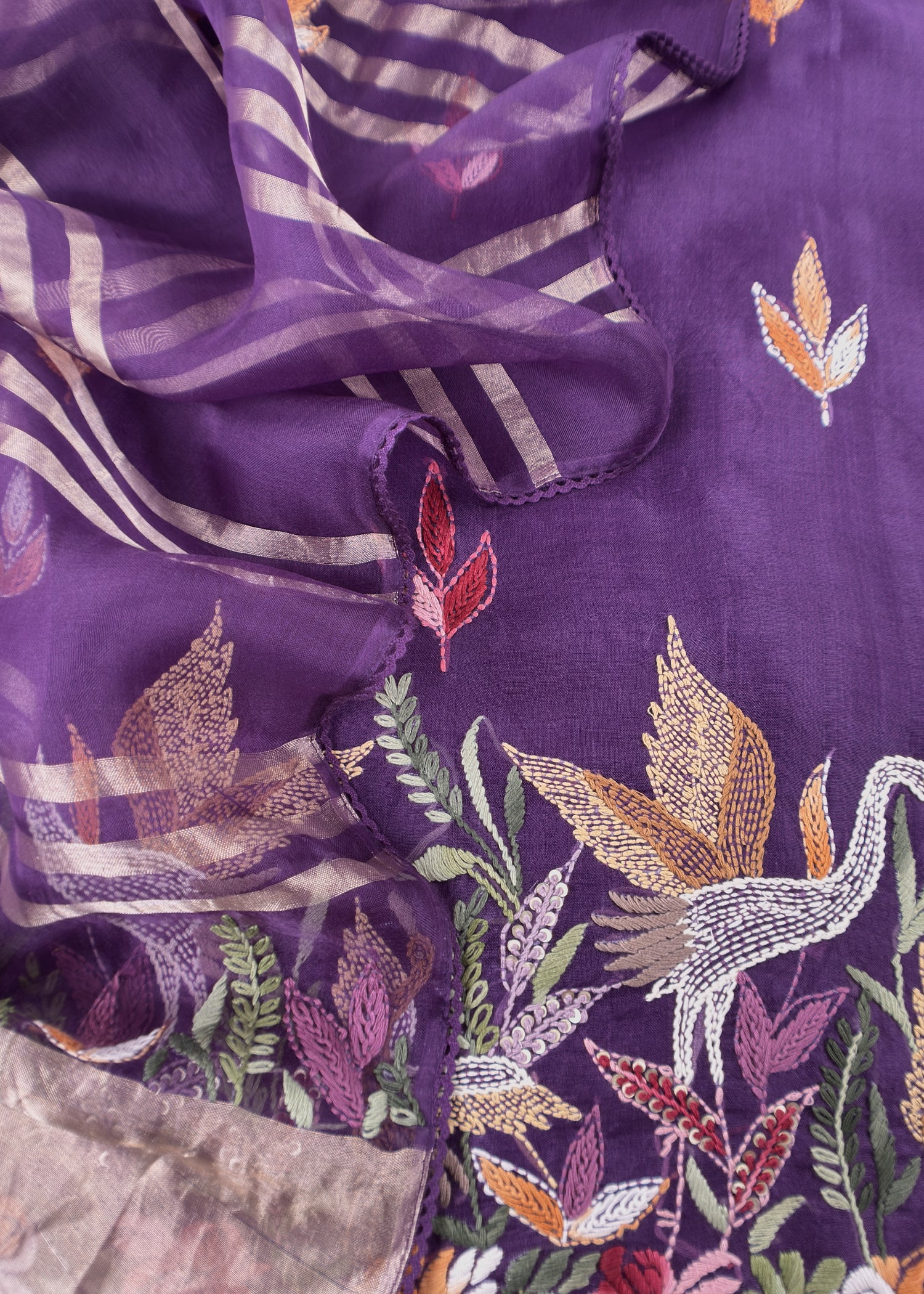 Purple Handloom Organza Silk Suit Fabric With Flamingos Kantha Handwork