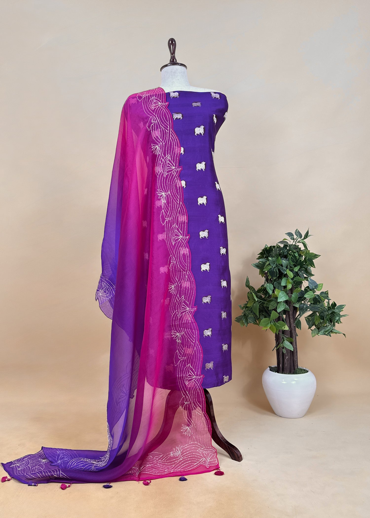 Pure Chiniya silk kurta with meenakari pichwai woven motifs paired with pure kora silk dupatta having double ombré shades with beautiful borders adorned with delicate cutdana handwork, comes with matching silk bottom.